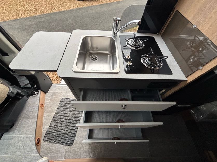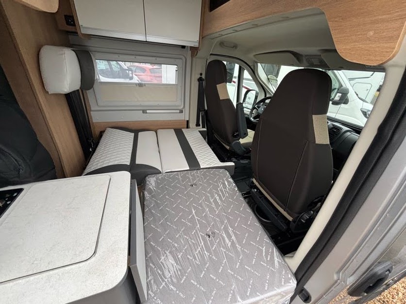 Cuisine en long, Douche à vario, Lit dînette avant, lit jumeaux, Salon avant sièges pivotants, WC Cassette.