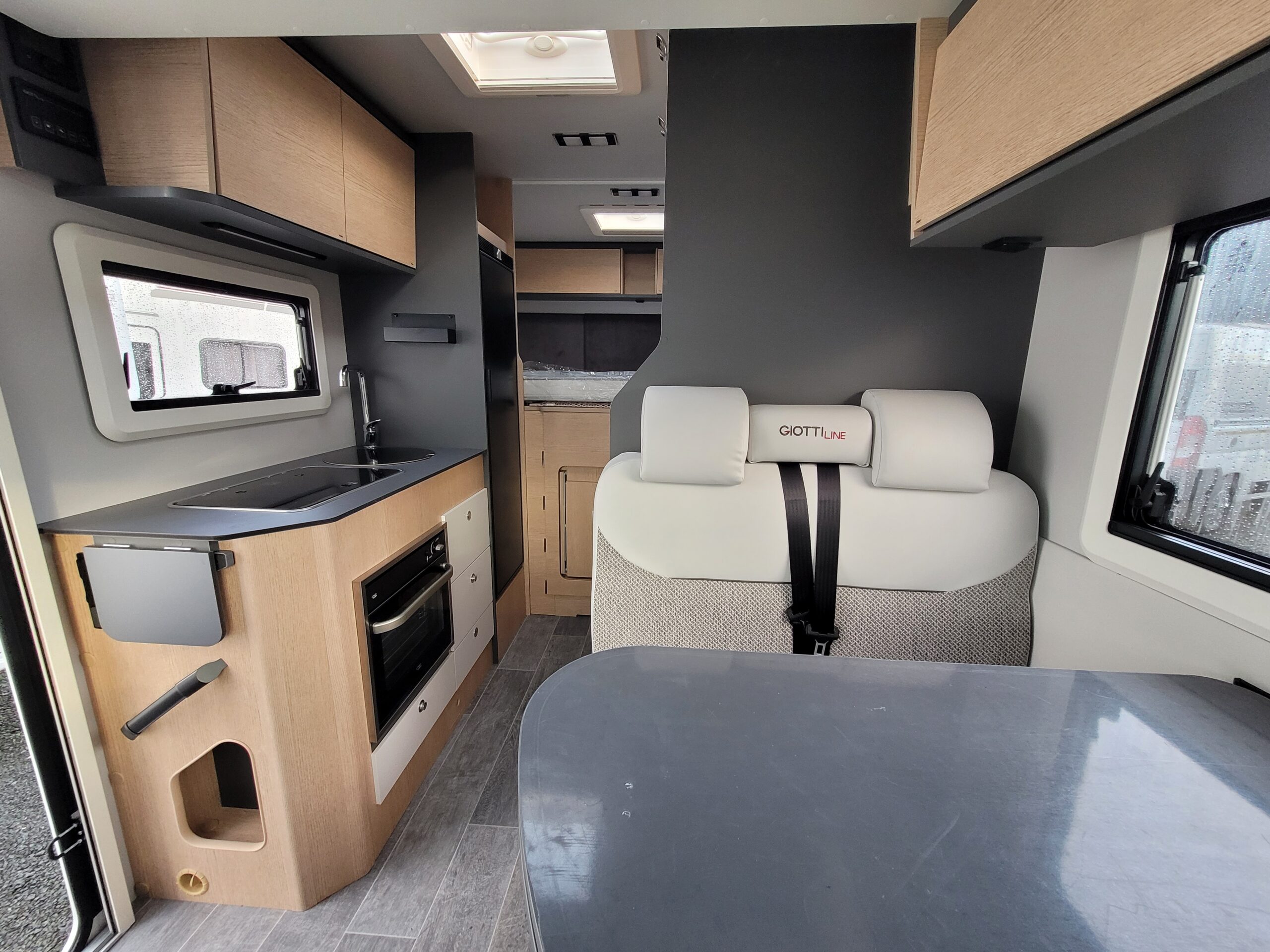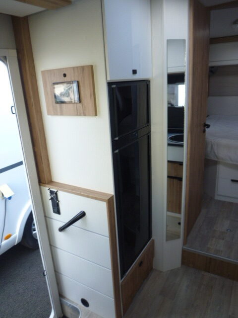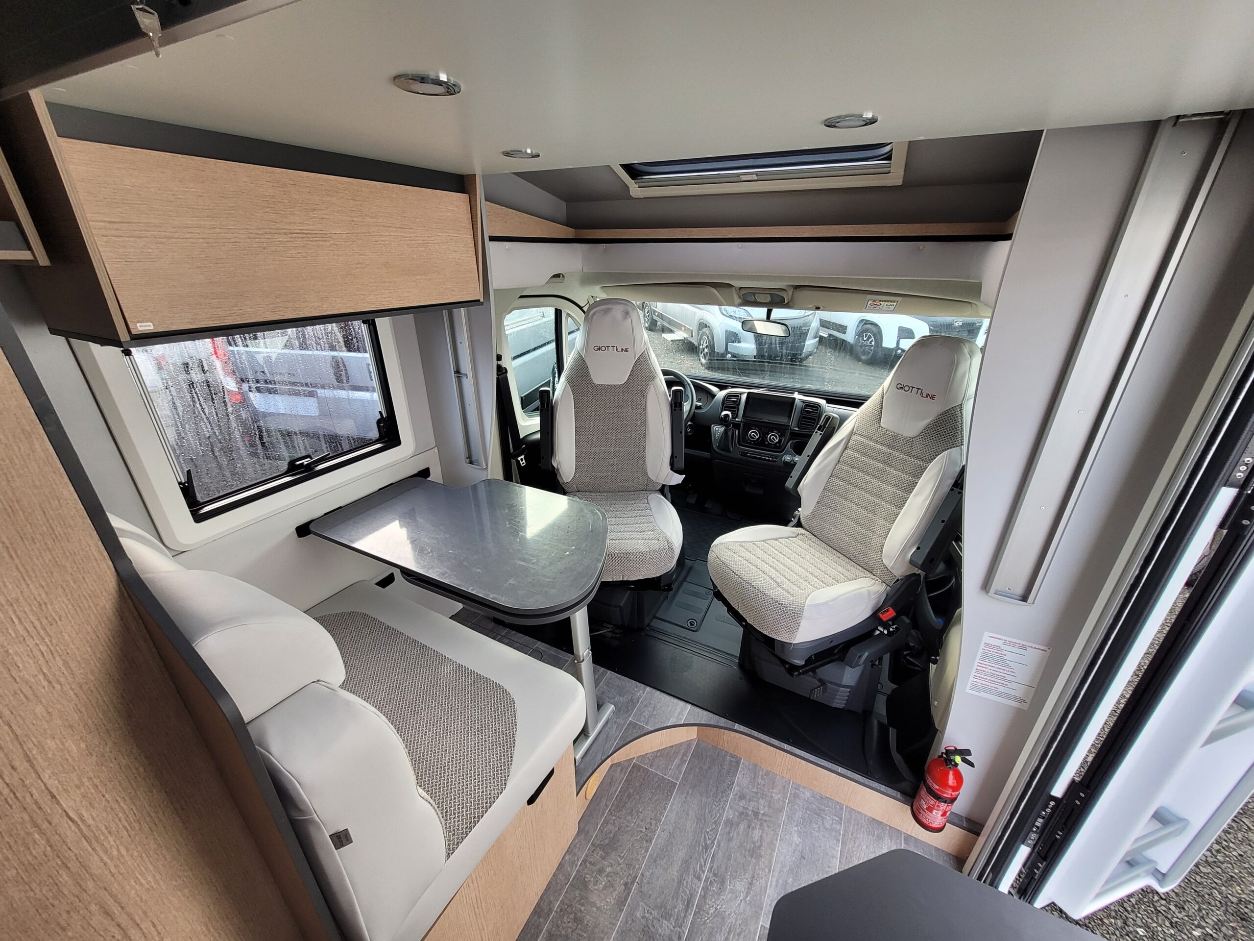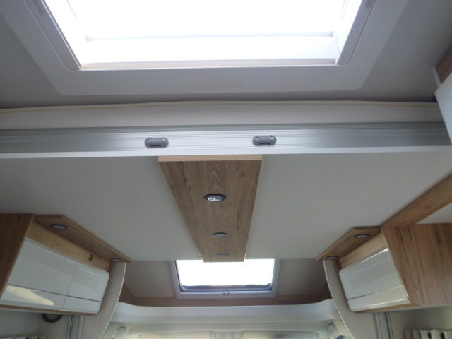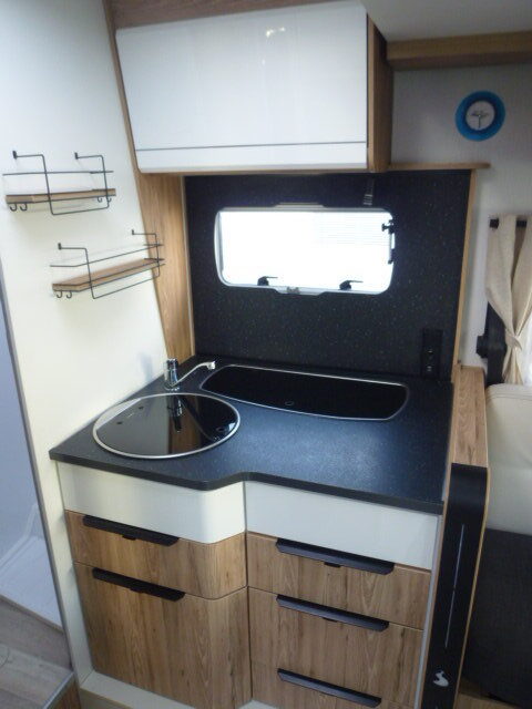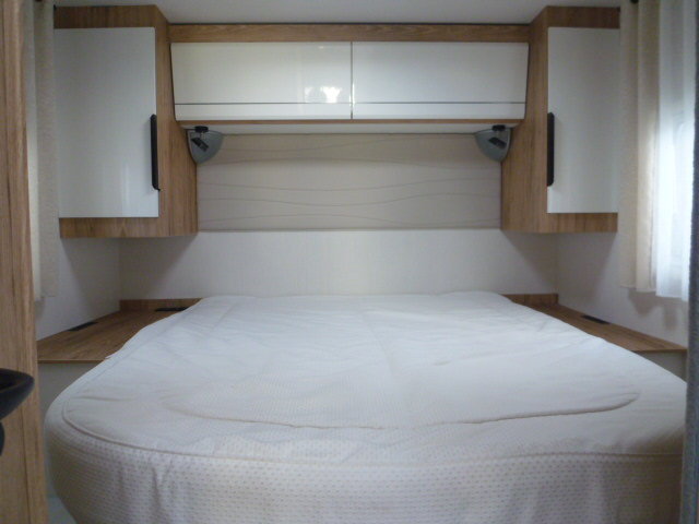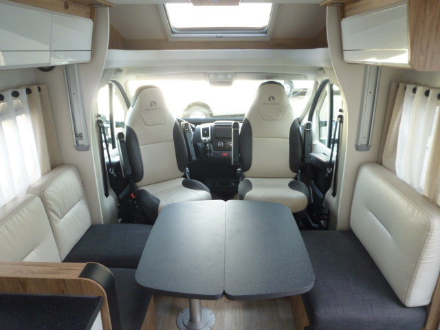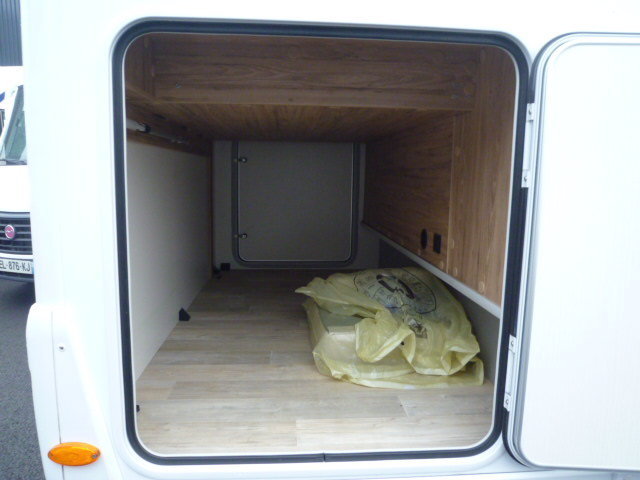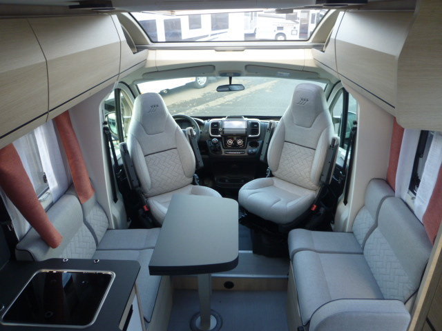Cuisine en L, Douche indépendante, Grande soute, lit jumeaux, lit pavillon, Salon avant banquettes face à face, Salon avant sièges pivotants, WC Cassette.