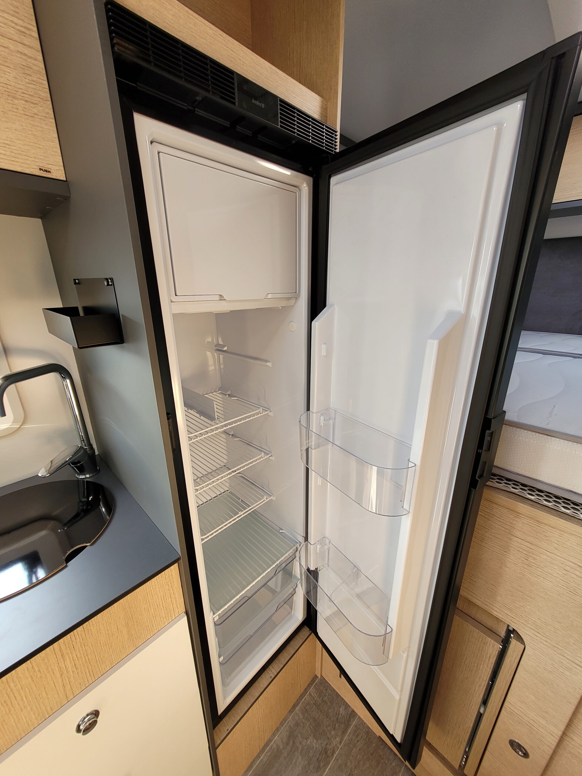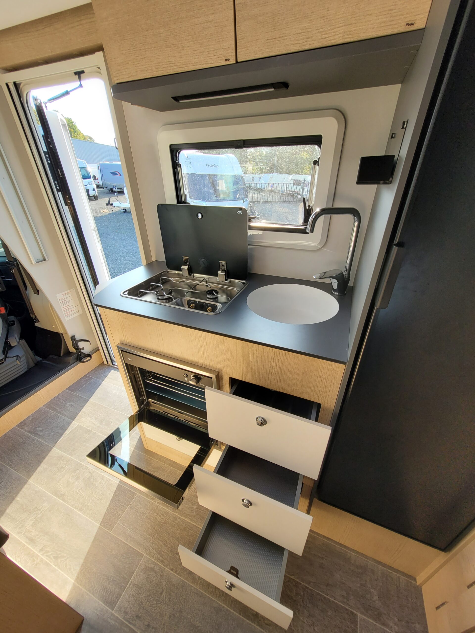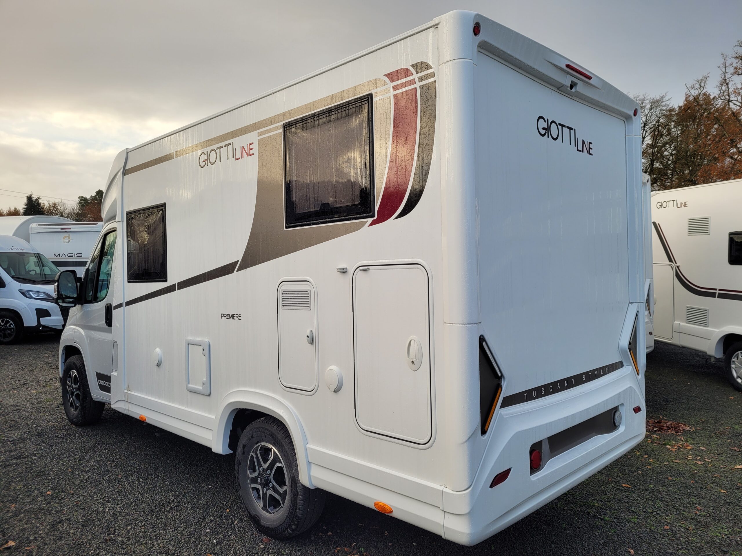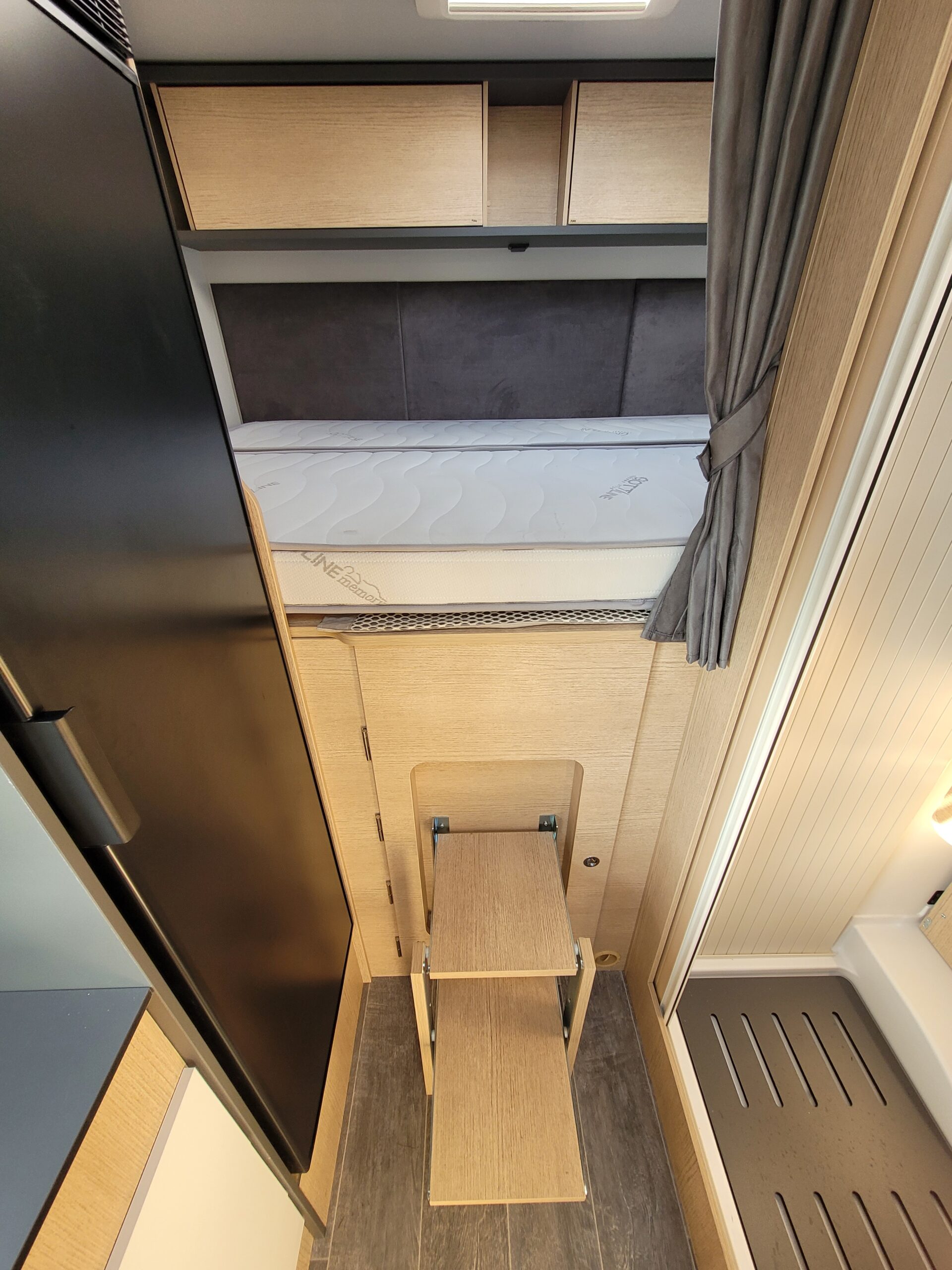 Cuisine en L, Douche indépendante, Grande soute, lit jumeaux, lit pavillon, Salon avant banquettes face à face, Salon avant sièges pivotants, WC Cassette.