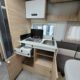 Cuisine en long, Douche indépendante, Grande soute, Lit central, lit pavillon, Salon avant banquettes face à face, Salon avant sièges pivotants, Soute.
