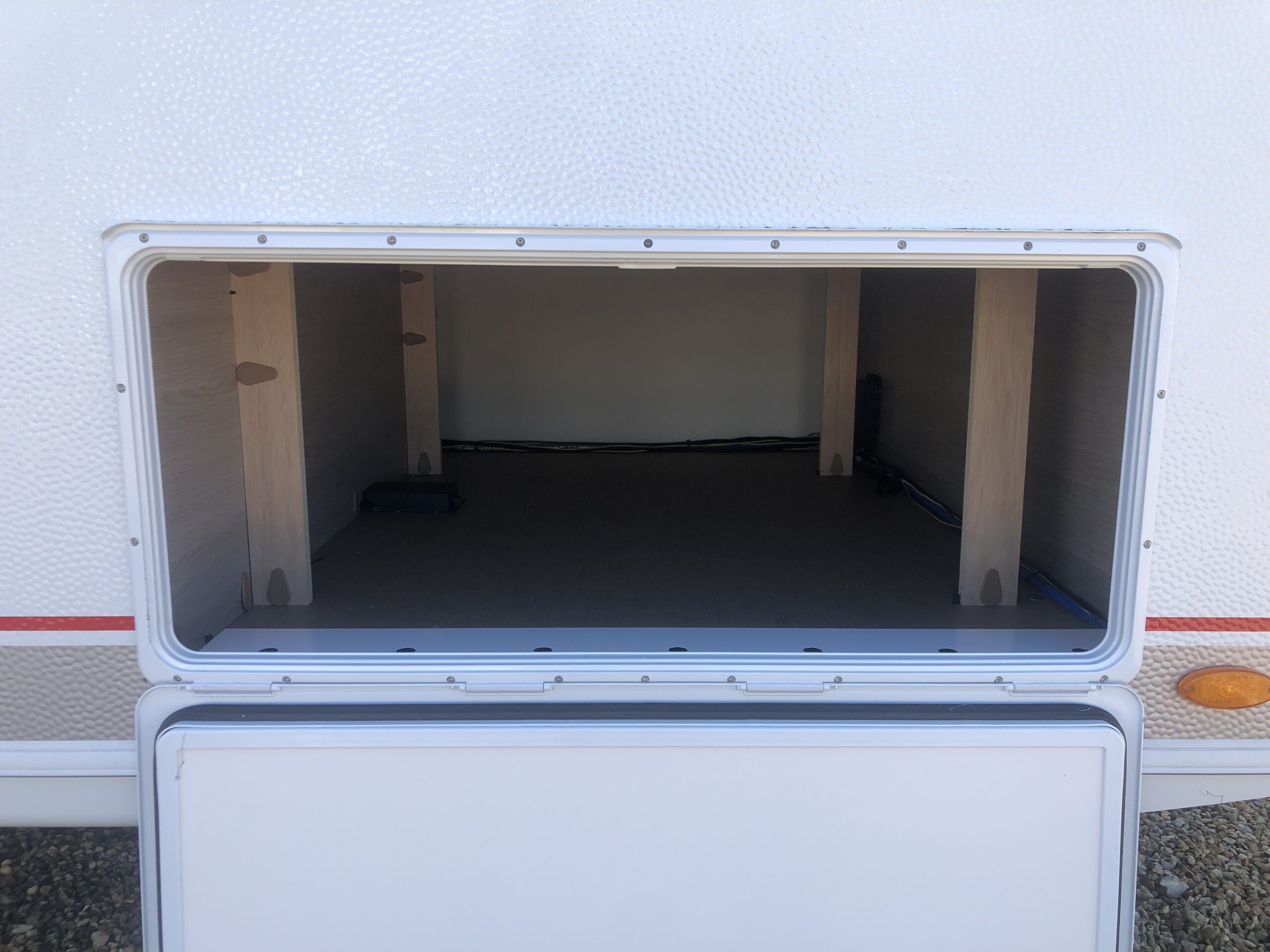 Bac de douche, Cuisine en L, Douche indépendante, Lit central, lit pavillon, Soute réglable en hauteur.