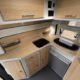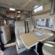 Bac de douche, Cuisine en L, Cuisine en long, Lit dînette avant, lit pavillon, Maxi salon, Salon avant sièges pivotants, WC Cassette.