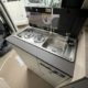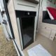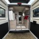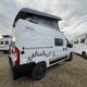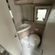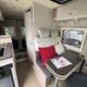 Bac de douche, Cuisine en long, Lit central transversal, Lit toit relevable, Salon avant sièges pivotants, WC Cassette.