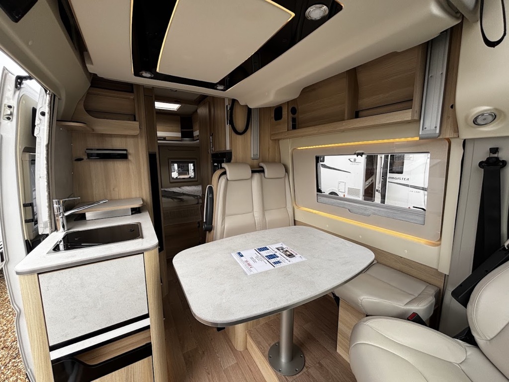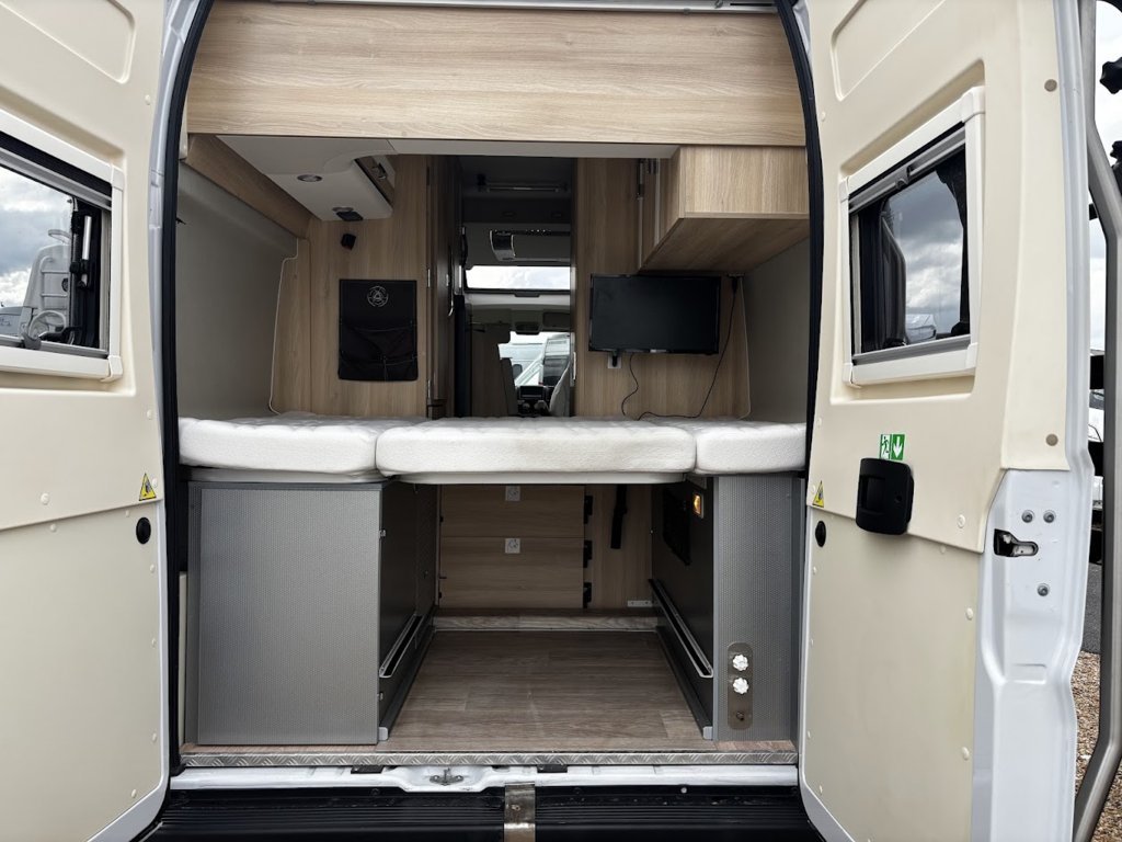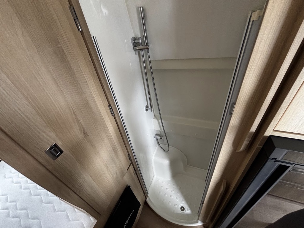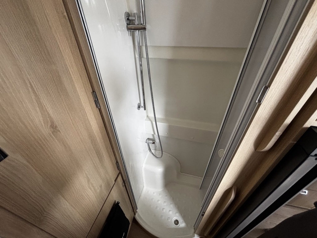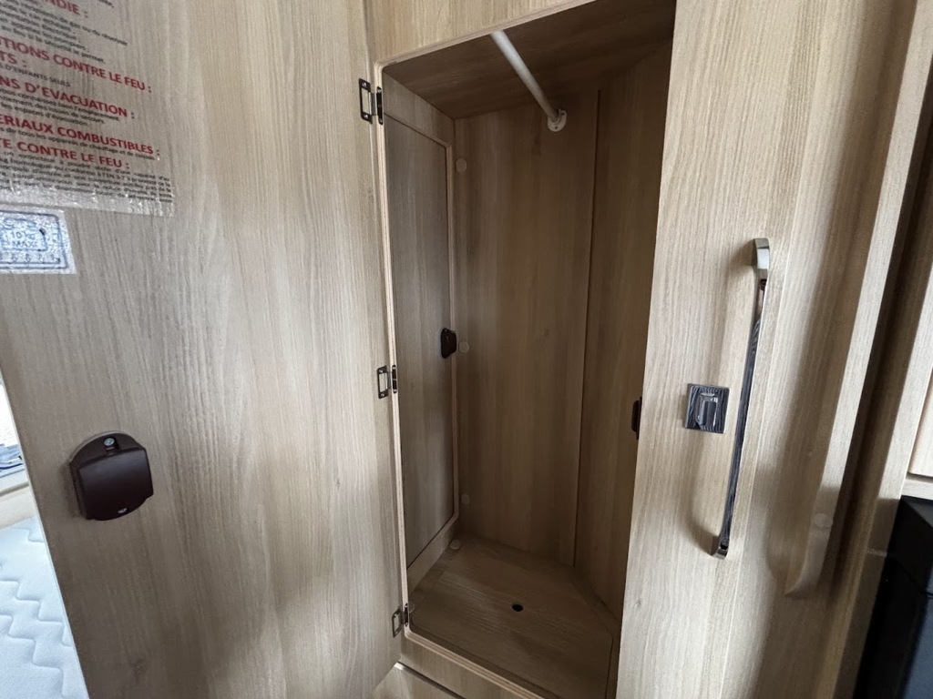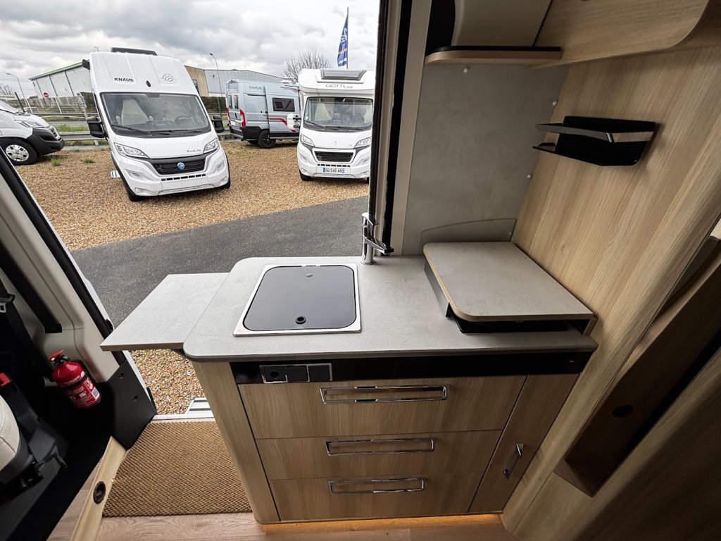 - Disposition : Cuisine en long, Douche indépendante, Lit arrière transversal, lit pavillon, Salon avant sièges pivotants, Salon en L, WC Cassette