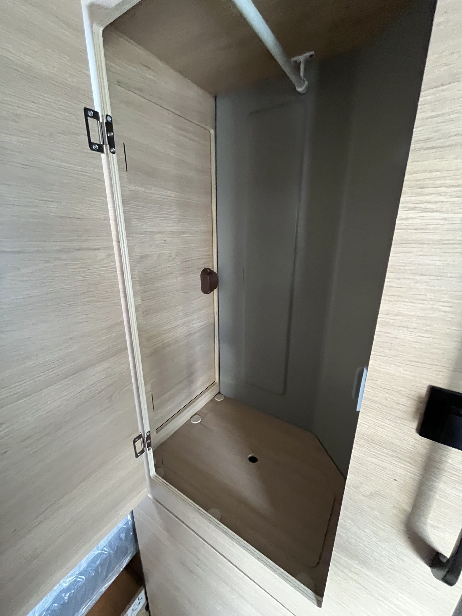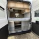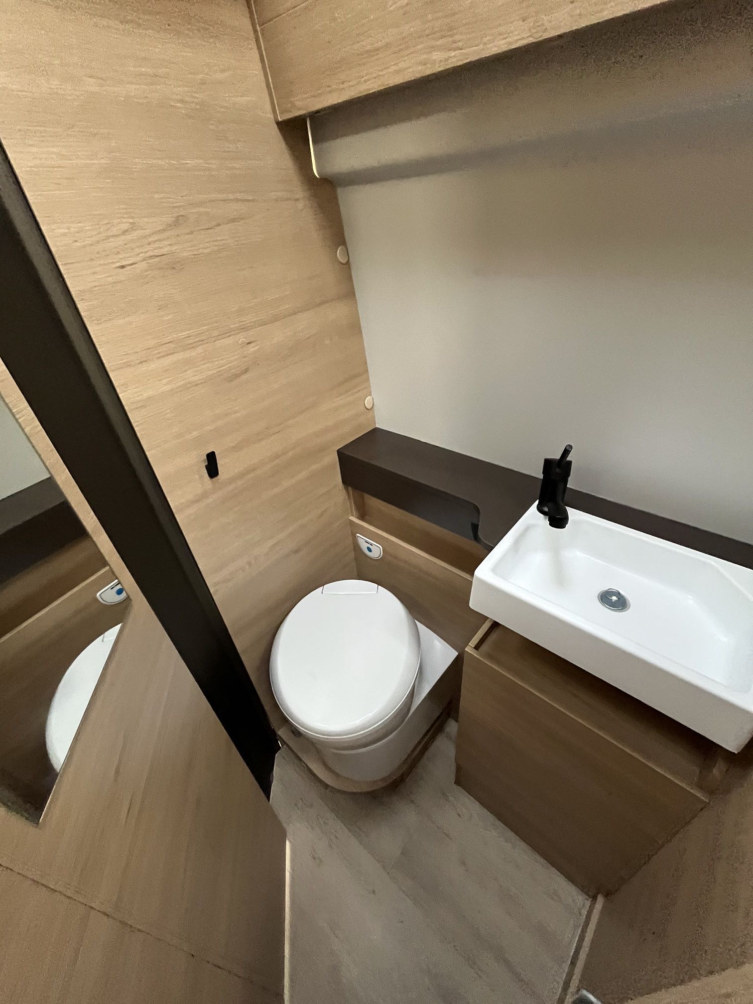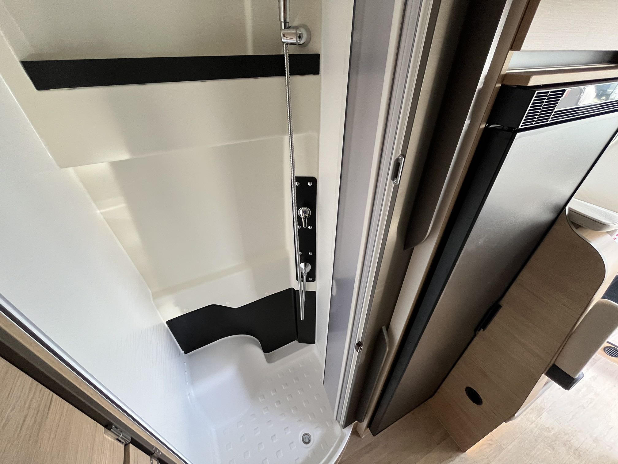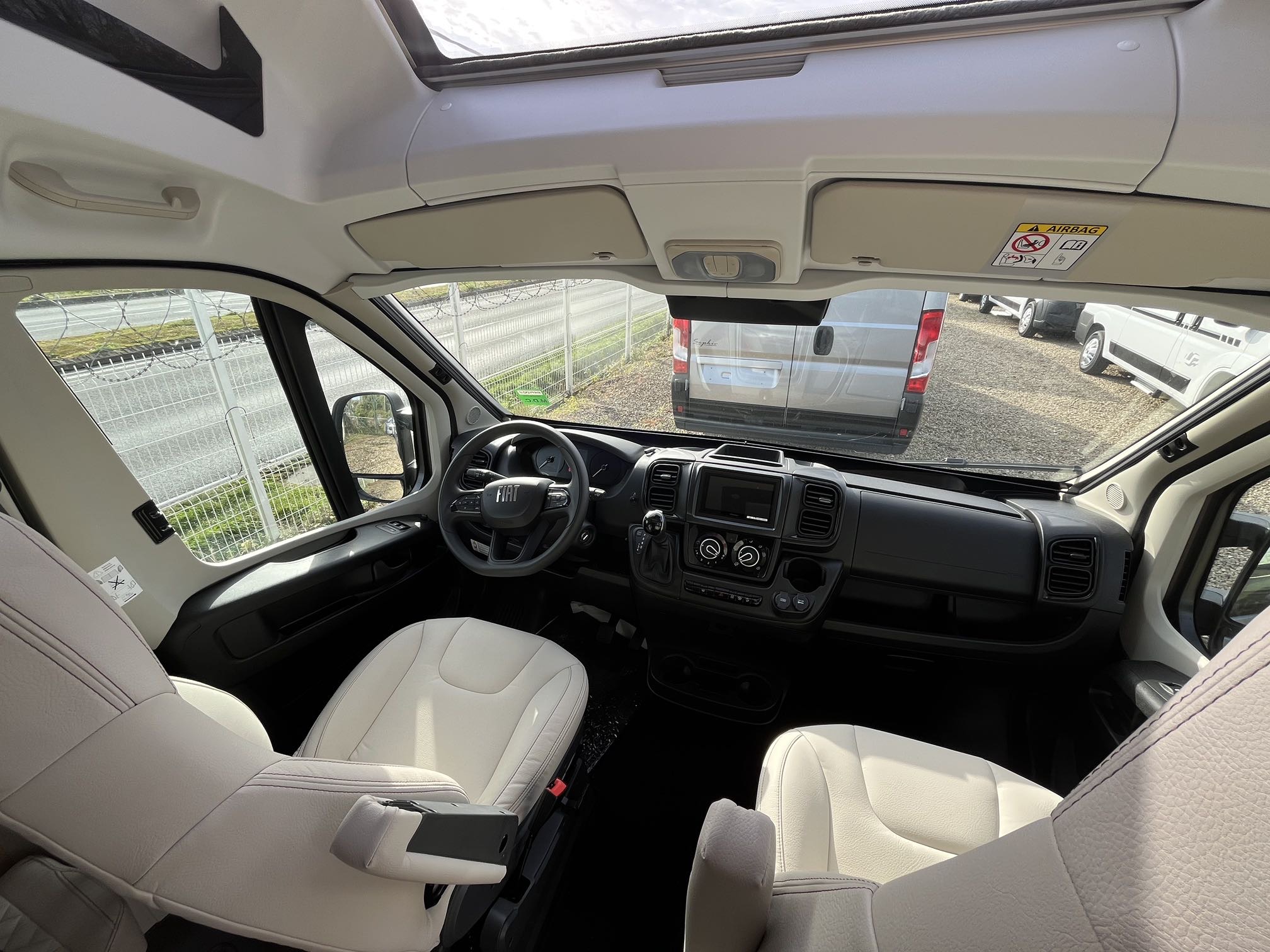 Douche indépendante, Lit arrière transversal, lit pavillon, Salon avant sièges pivotants, WC Cassette.