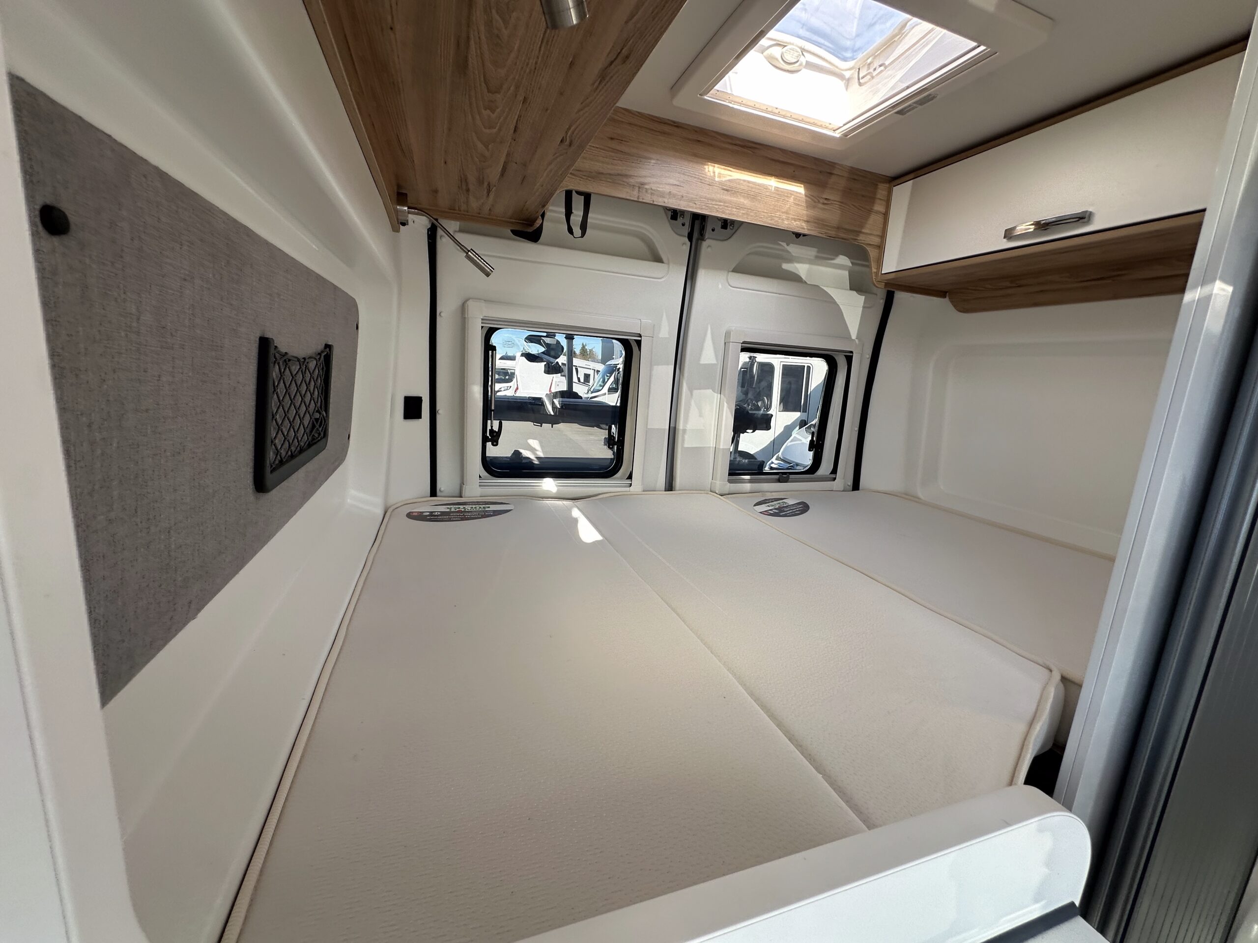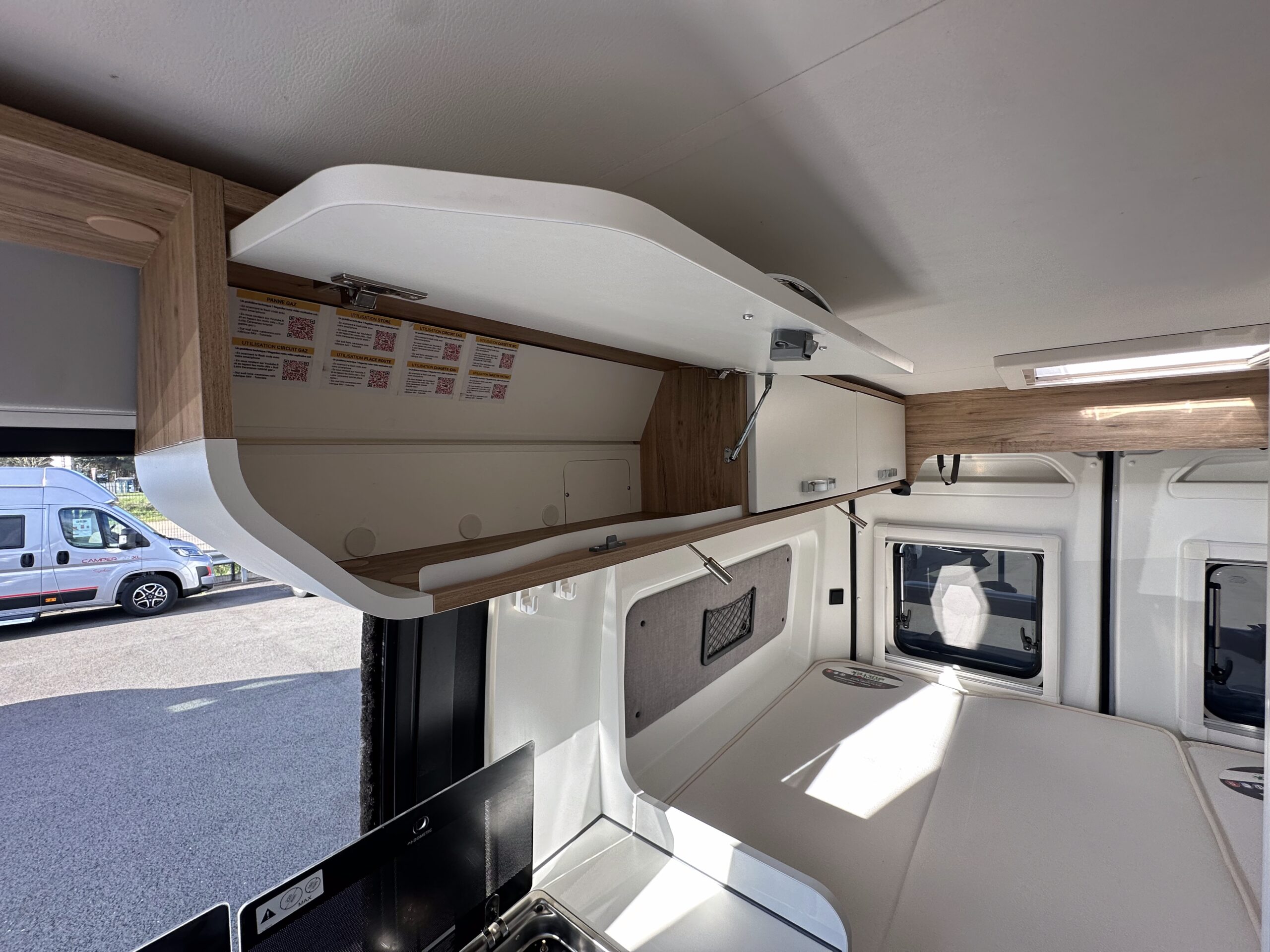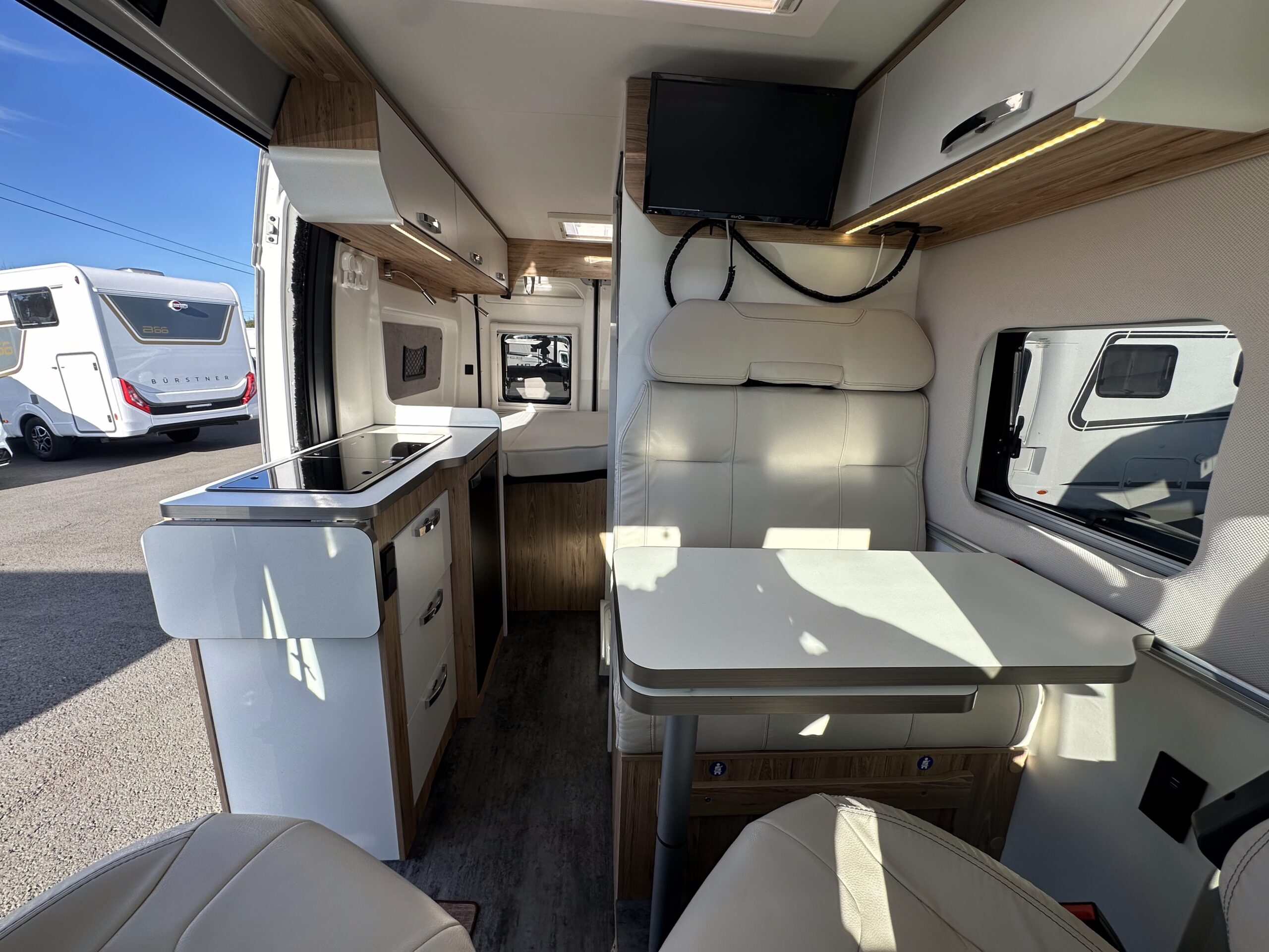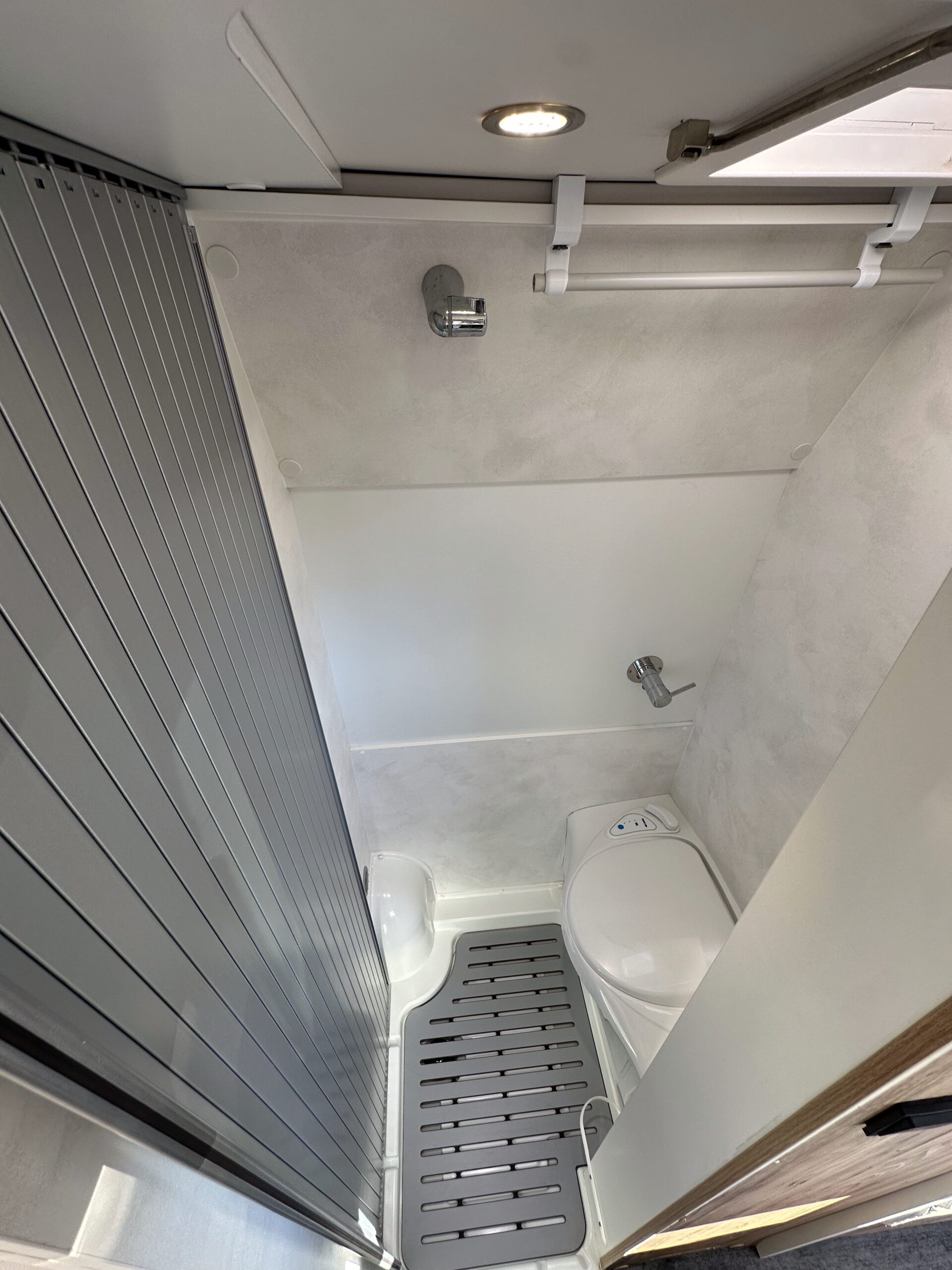- Disposition : Douche indépendante, Lit arrière transversal, lit pavillon, Salon avant sièges pivotants, WC Cassette