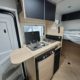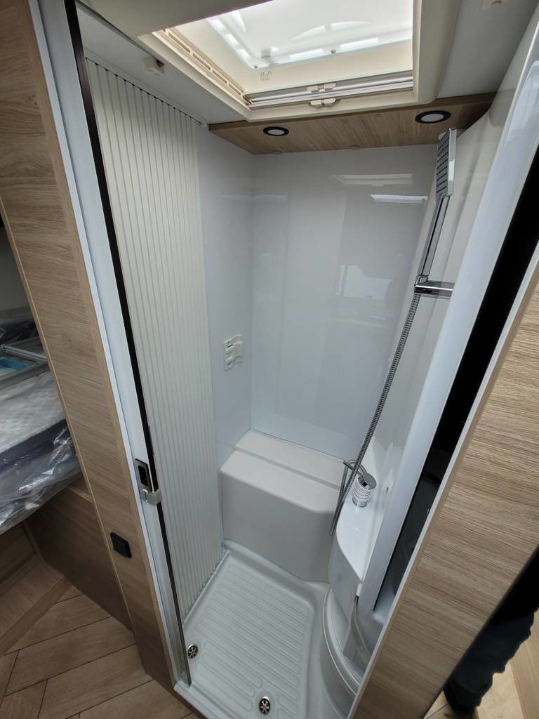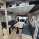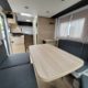 Cuisine en long, Douche à vario, Lit arrière transversal, lit pavillon, Salon avant banquettes face à face, Salon avant sièges pivotants, Soute, WC Cassette.