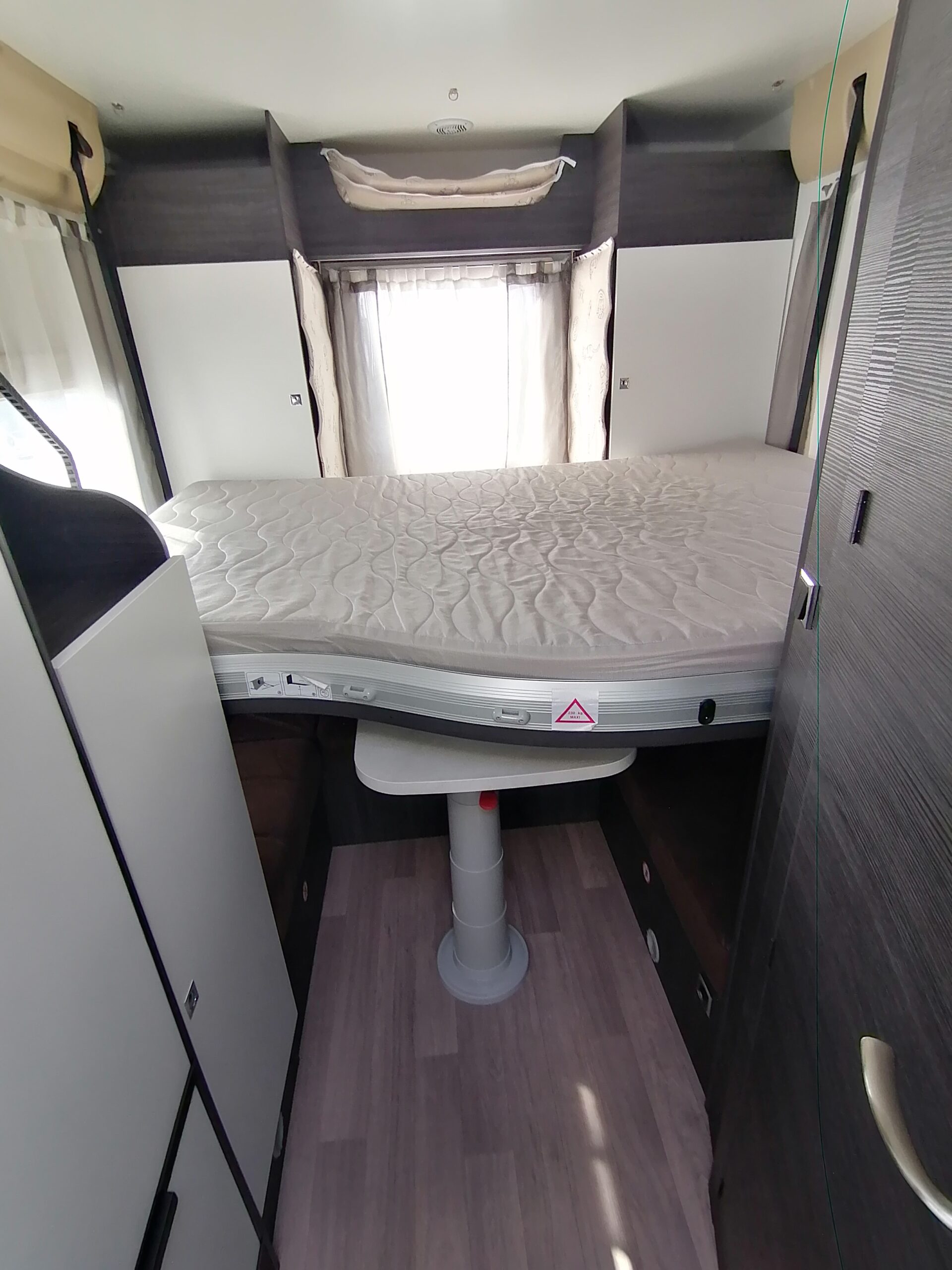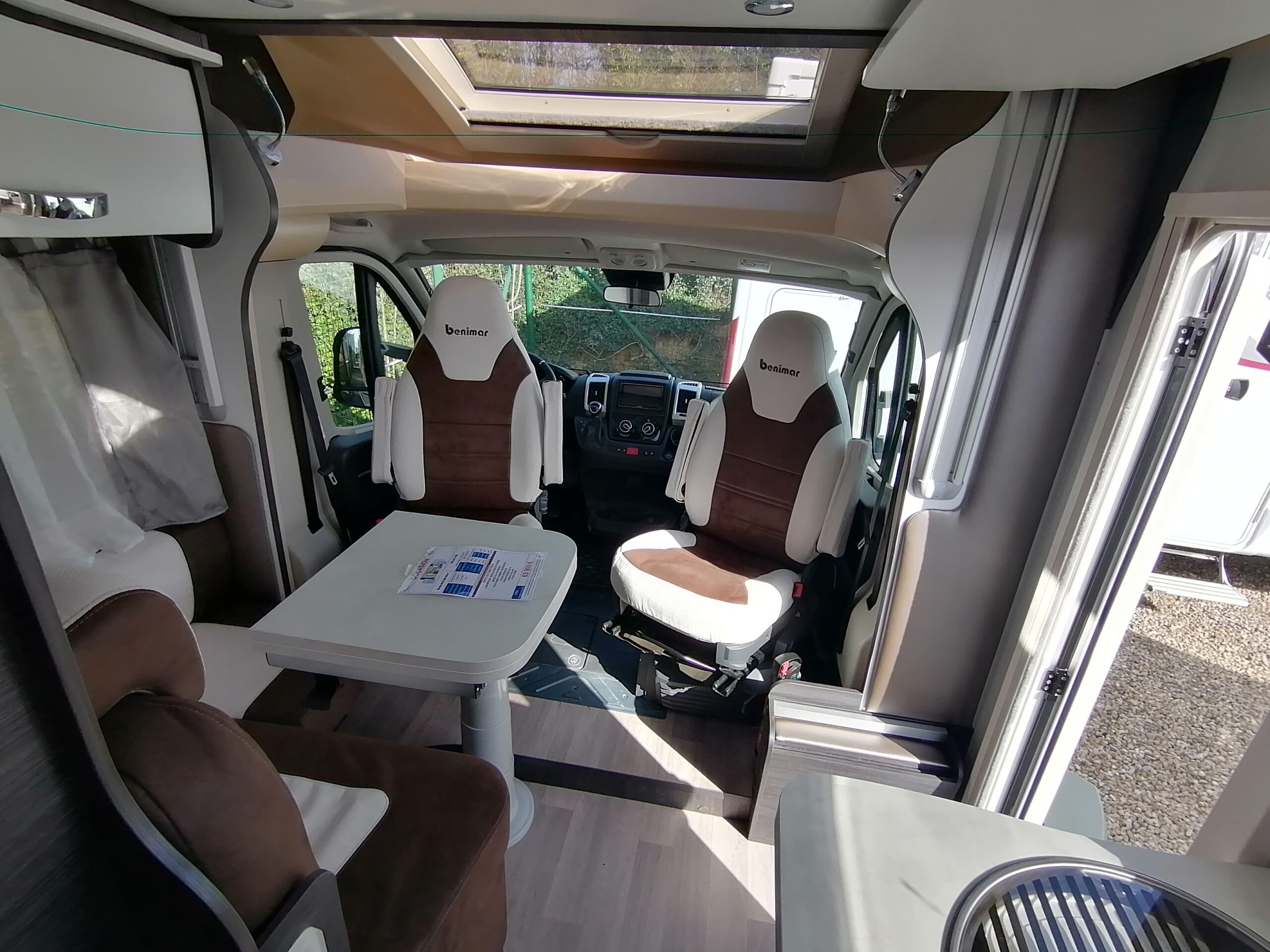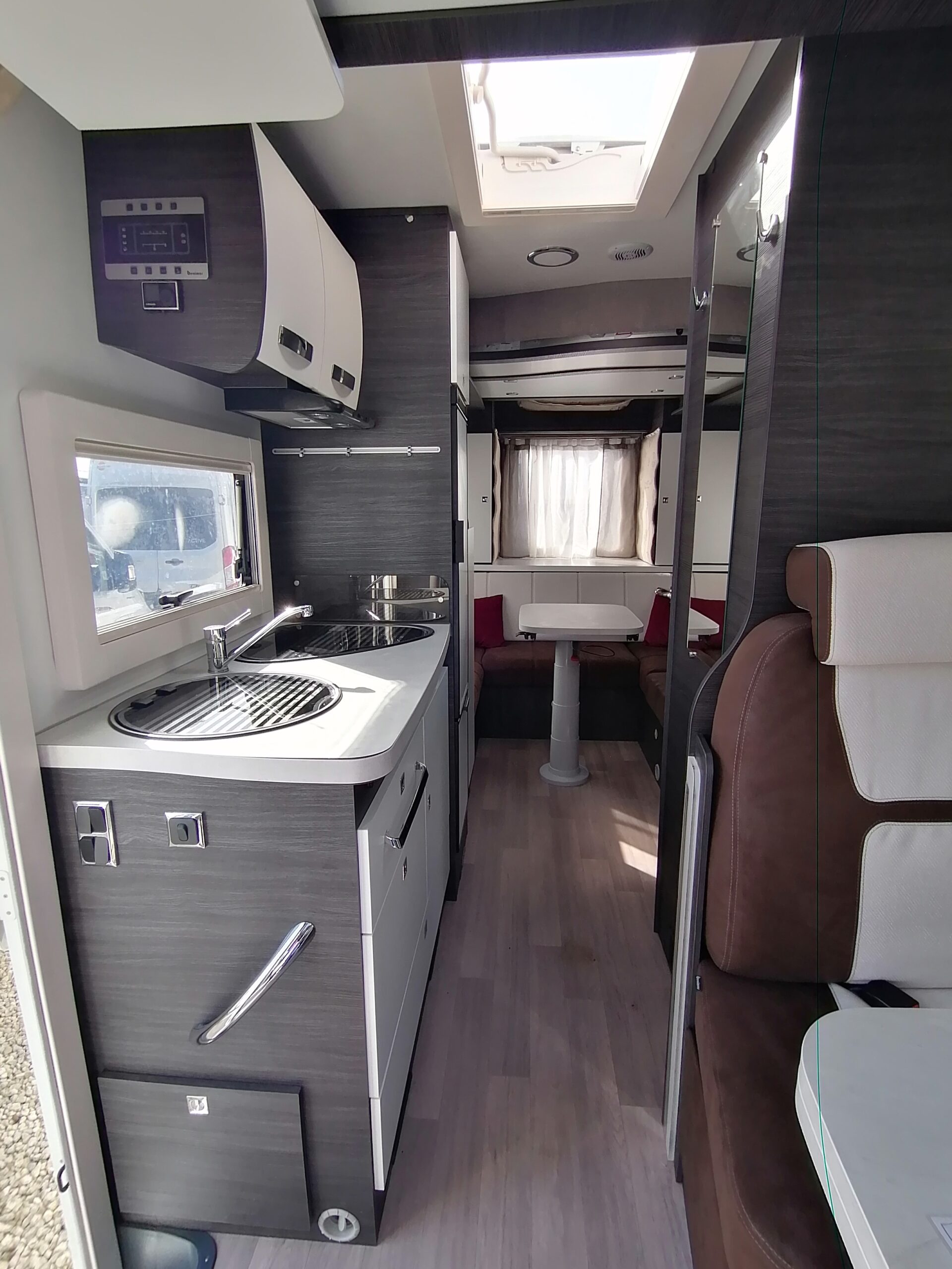 - Disposition : Cuisine en long, Douche à vario, Lit arrière transversal, lit pavillon, Salon avant banquettes face à face, Salon avant sièges pivotants, Soute, WC Cassette