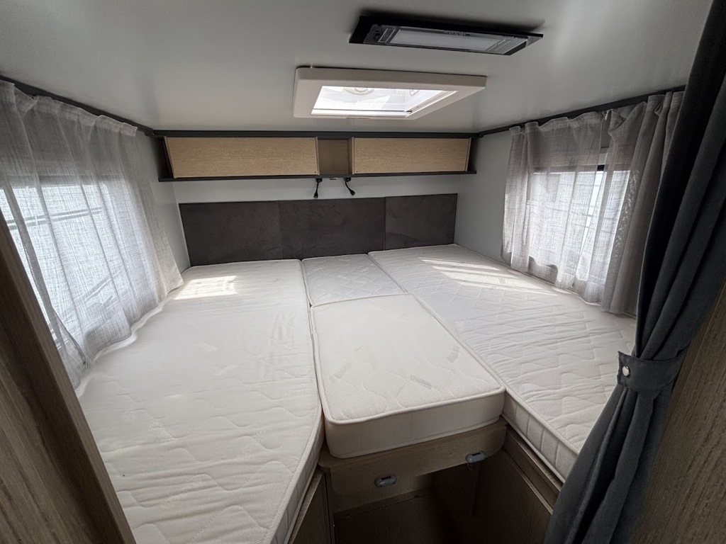 Cuisine en long, Douche à vario, Grande soute, Lit dînette avant, lit jumeaux, Salon avant sièges pivotants, WC Cassette.