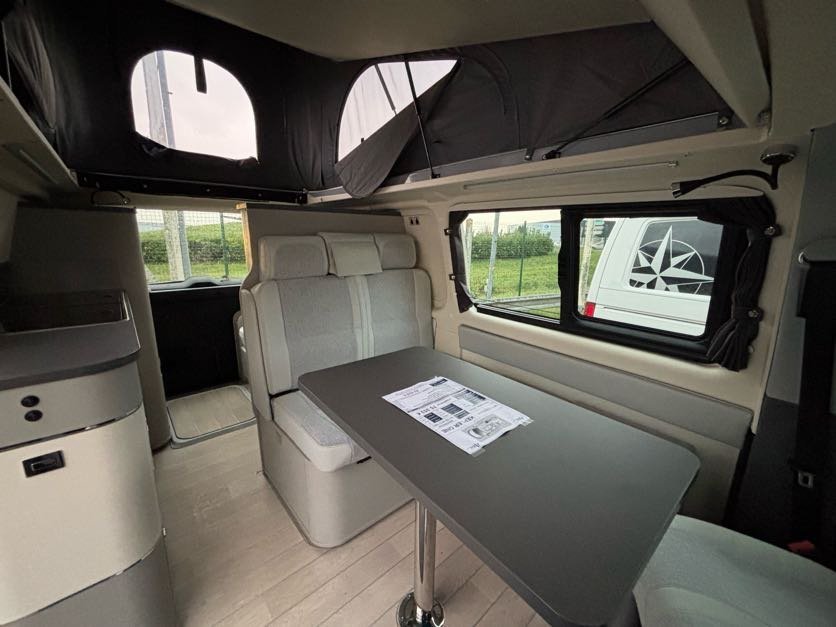 - Disposition : Bac de douche, Cuisine en long, Lit dînette avant, Lit toit relevable, Salon avant sièges pivotants, WC Cassette