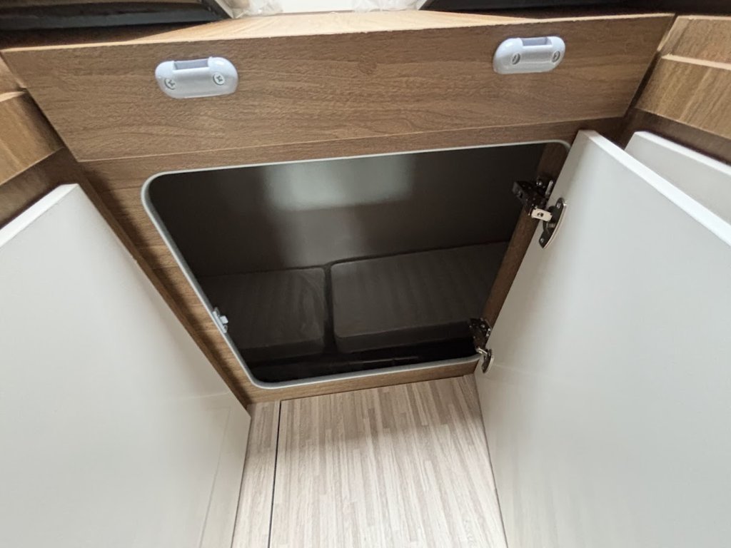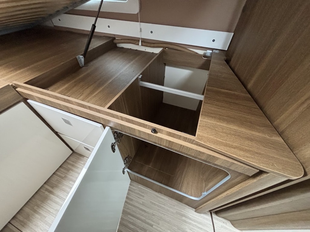 - Disposition : Douche indépendante, Grande soute, lit jumeaux, lit pavillon cabine, Salon avant sièges pivotants, WC Cassette