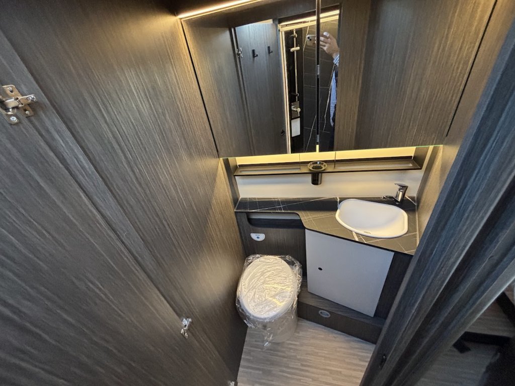 Bac de douche, Douche indépendante, Lit central, lit pavillon, Salon avant banquettes face à face, Soute.