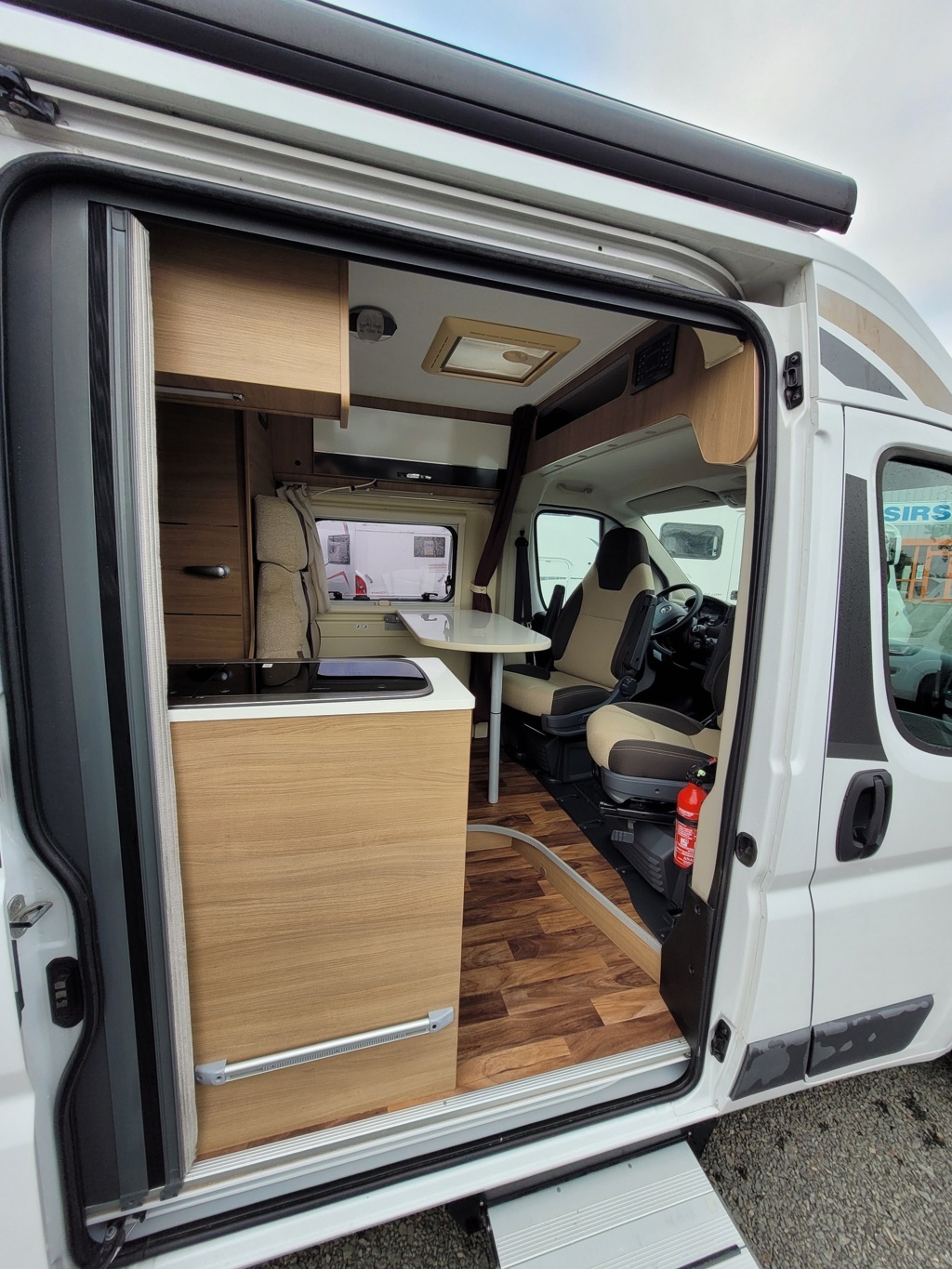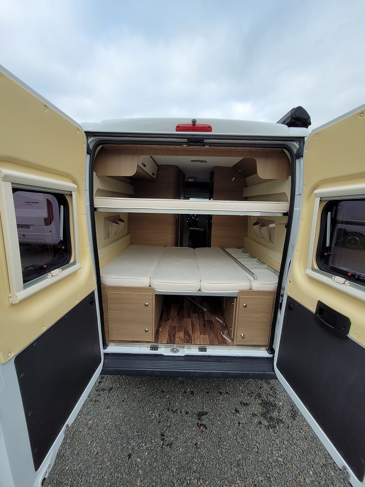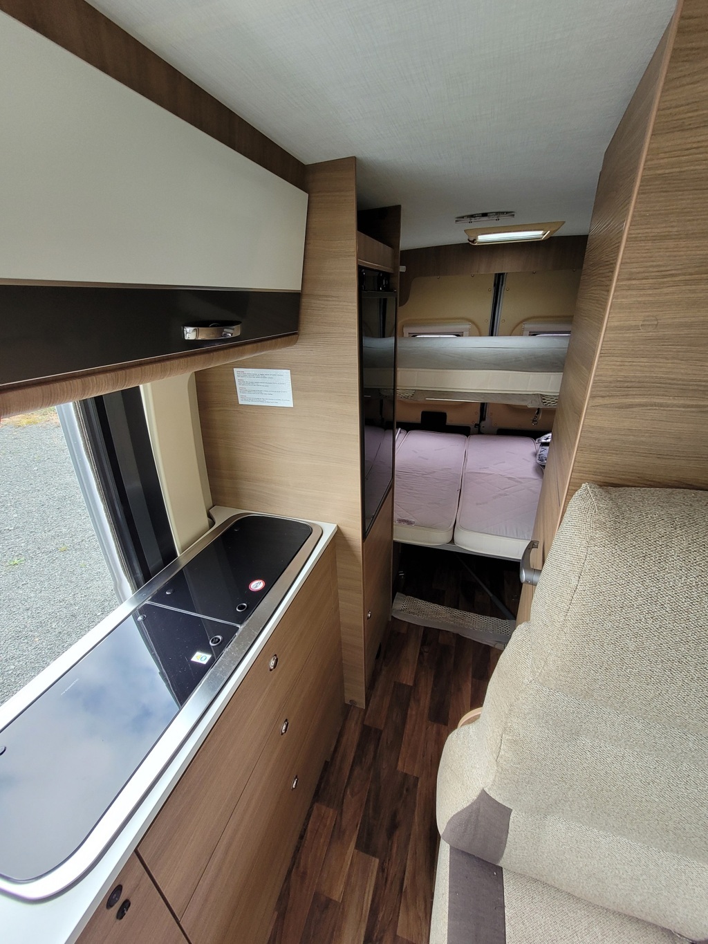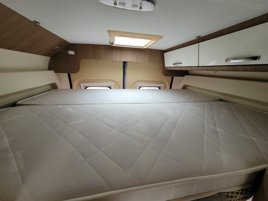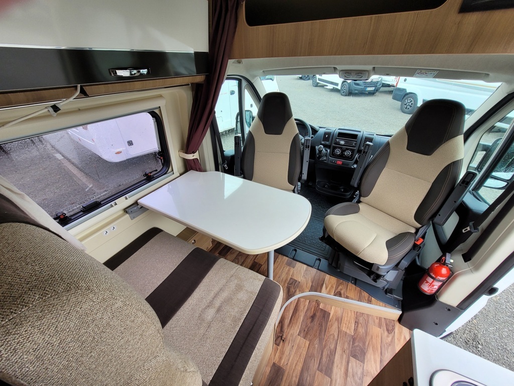 - Disposition : Bac de douche, Cuisine en long, Lit arrière transversal, Lit dînette avant, Salon avant sièges pivotants, WC Cassette