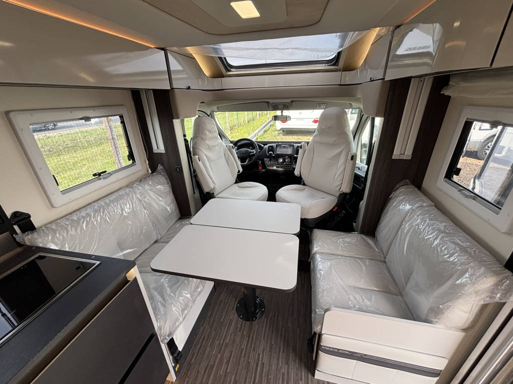 Soit prix total du véhicule exposé : 72 900 € - Disposition : Cuisine en L, Douche indépendante, Lit central, lit pavillon, Salon avant banquettes face à face, Salon avant sièges pivotants, WC Cassette