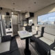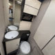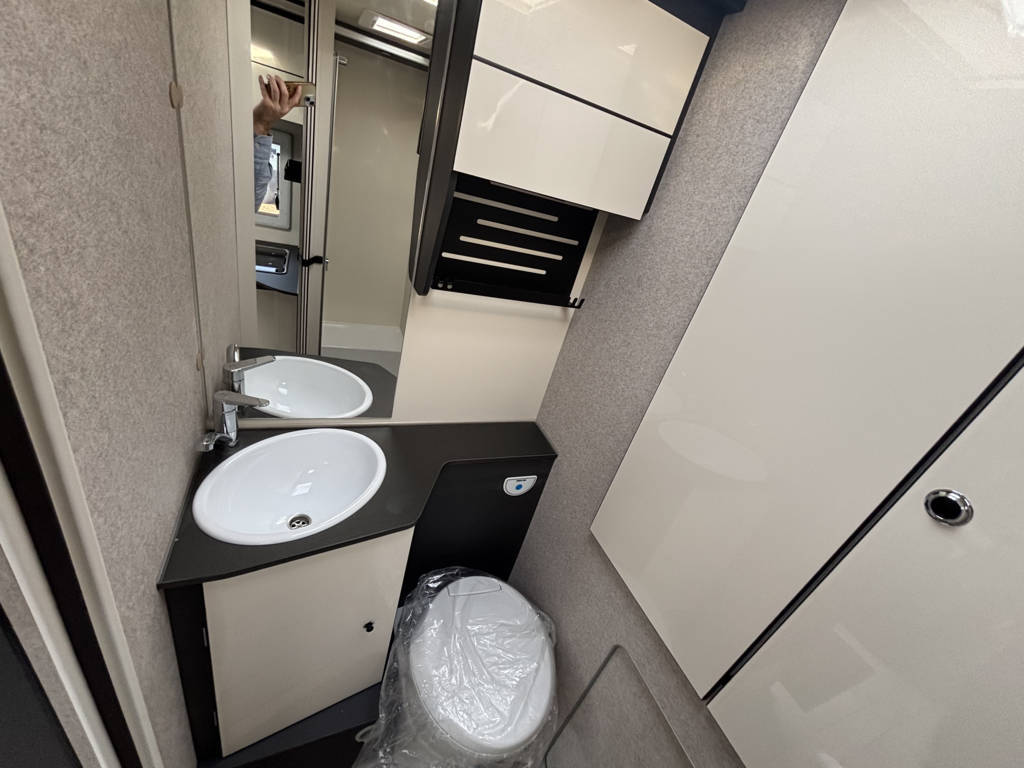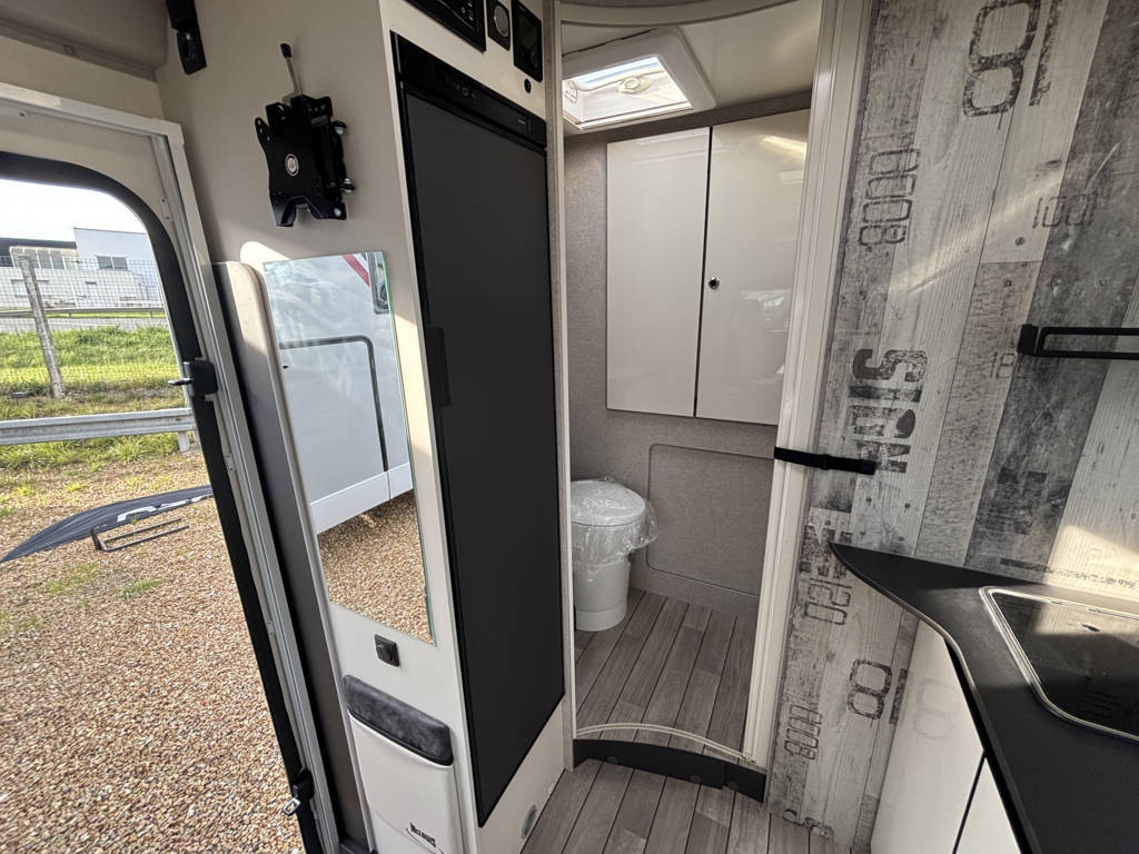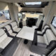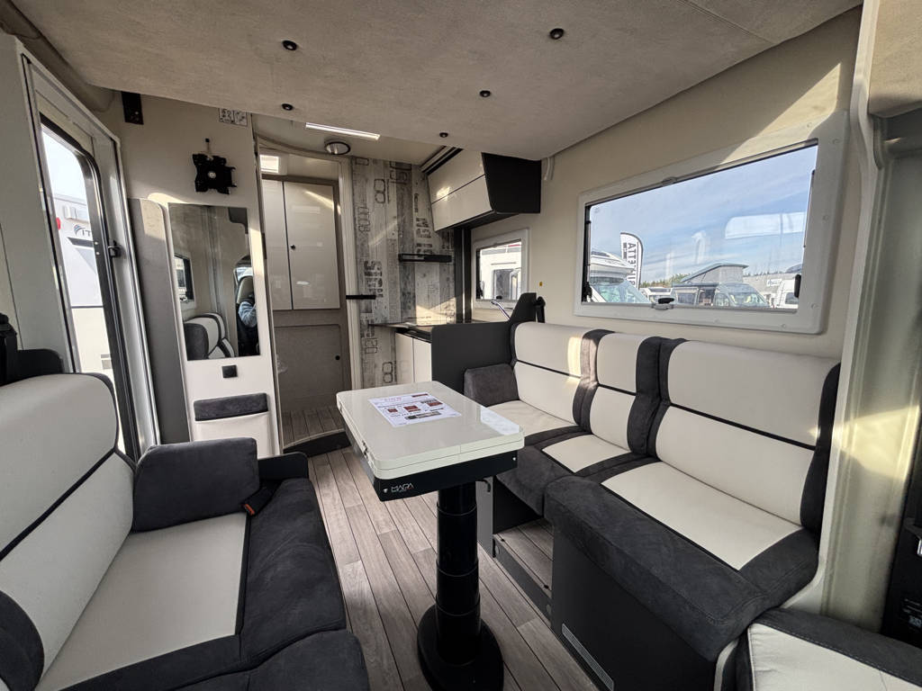 Cuisine en L, Douche indépendante, Lit dînette avant, lit pavillon, Maxi salon, Salon avant banquettes face à face, Salon avant sièges pivotants, Soute, WC Cassette.