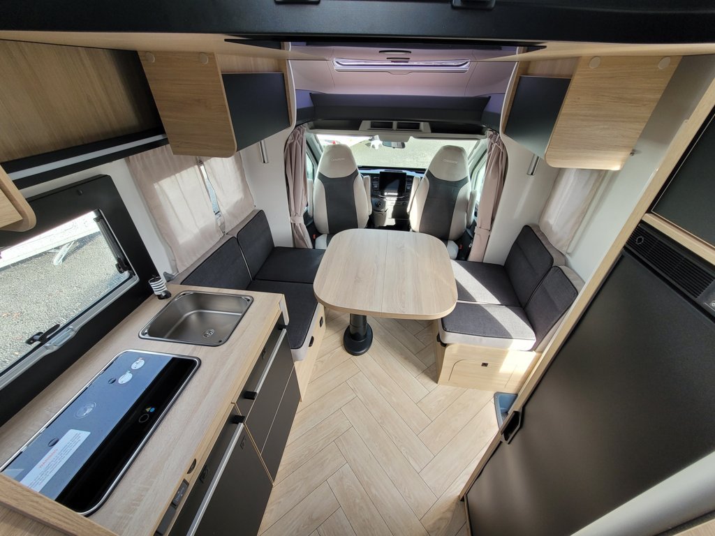 - Disposition : Cuisine en L, Douche indépendante, Lit dînette avant, lit jumeaux, lit pavillon, Salon avant sièges pivotants, Salon en L, WC Cassette