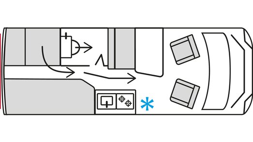 Cuisine en L, Douche indépendante, Lit dînette avant, lit pavillon, Salon avant banquettes face à face, Salon avant sièges pivotants, Soute, WC Cassette.