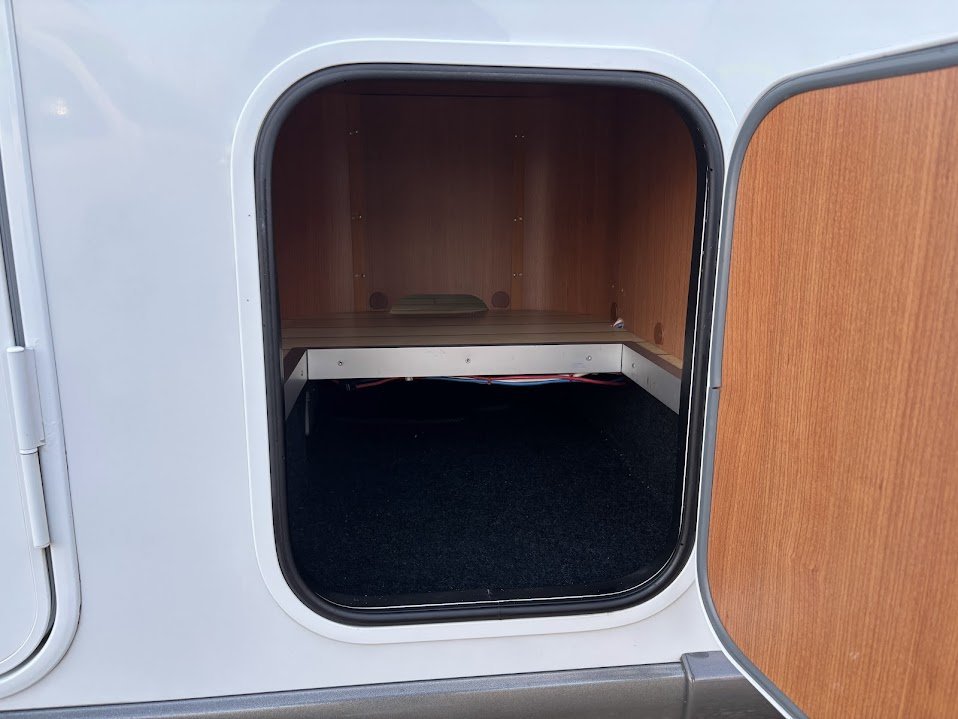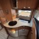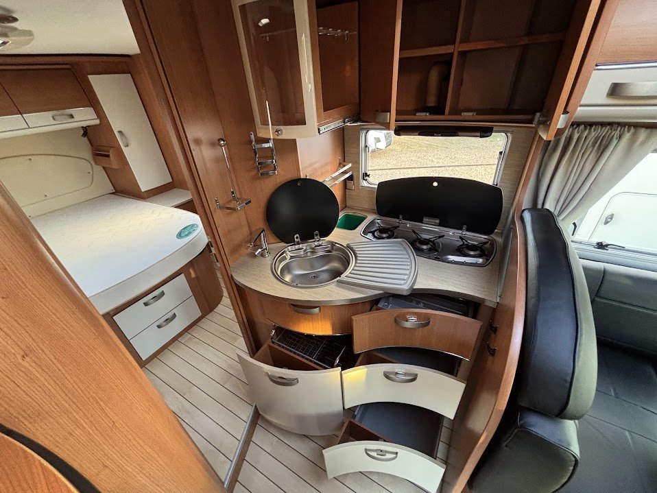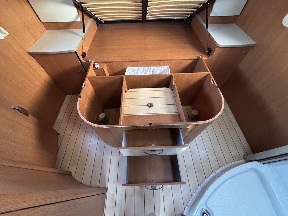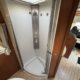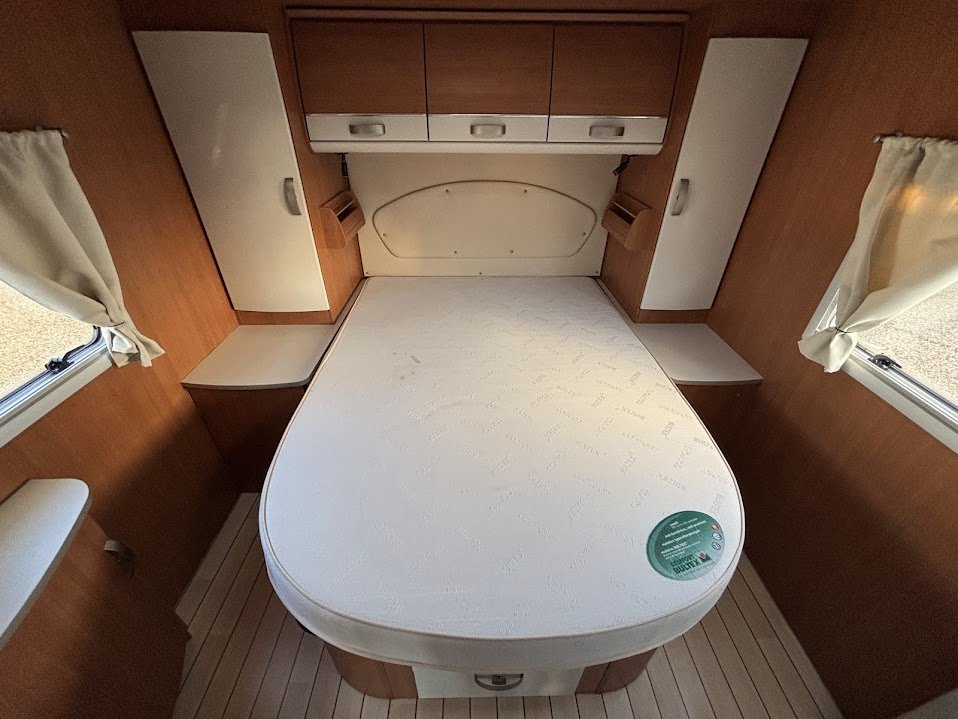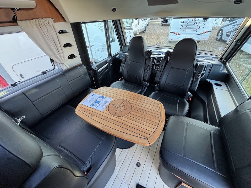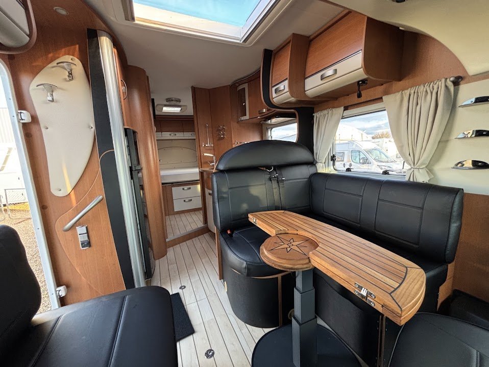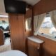 Cuisine en L, Douche indépendante, Lit central, lit pavillon cabine, Salon avant sièges pivotants, Salon en L, Soute, WC Cassette.