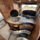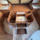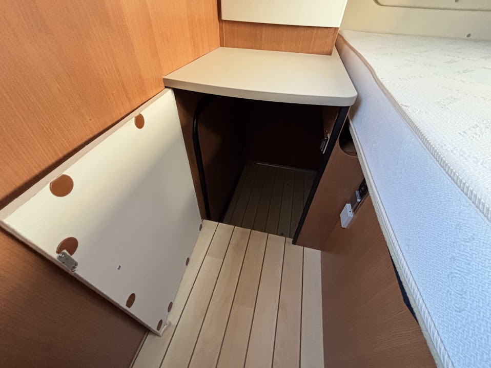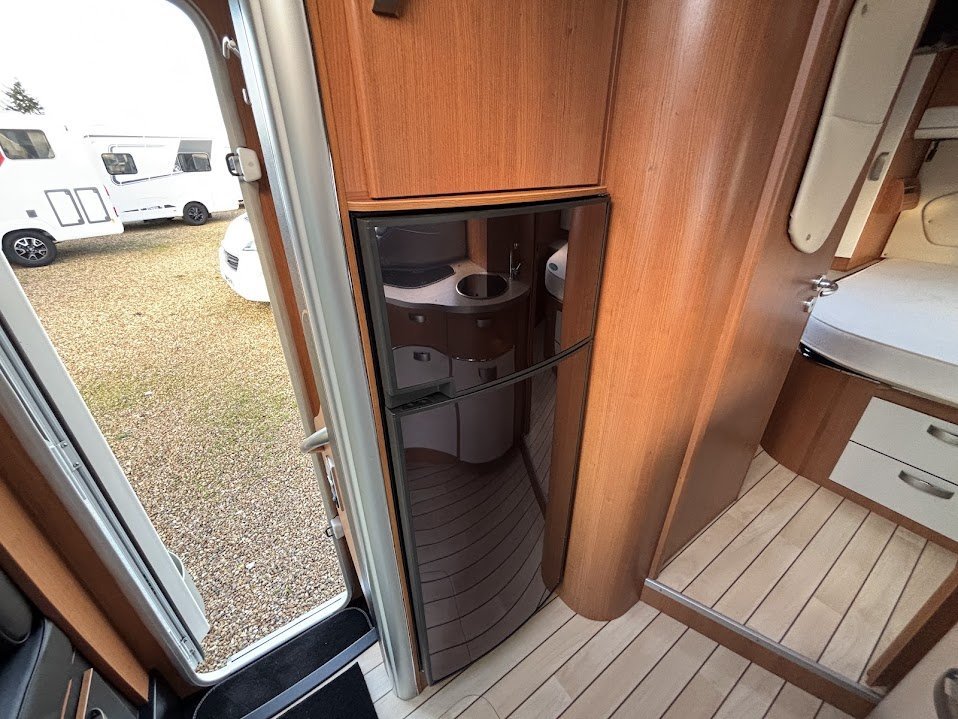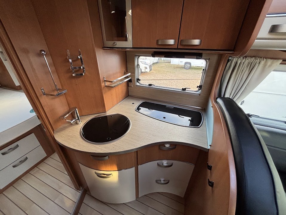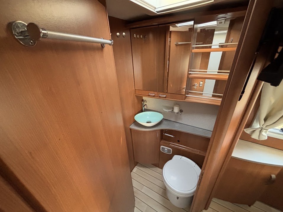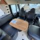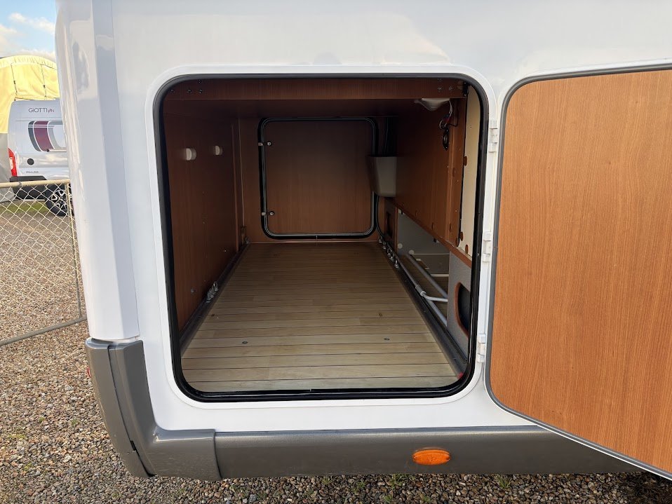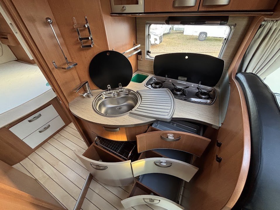 Cuisine en L, Douche indépendante, Lit central, lit pavillon cabine, Salon avant sièges pivotants, Salon en L, Soute, WC Cassette.
