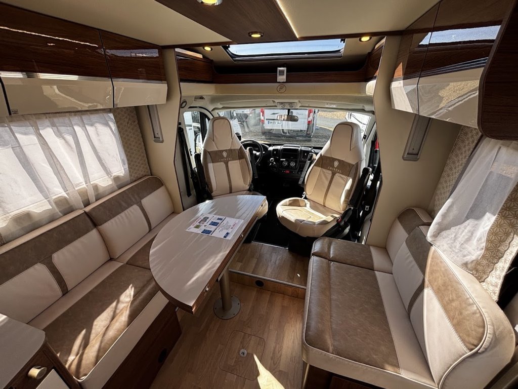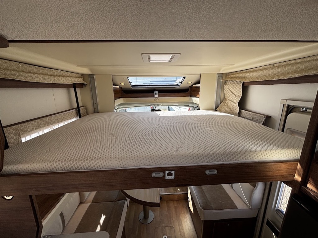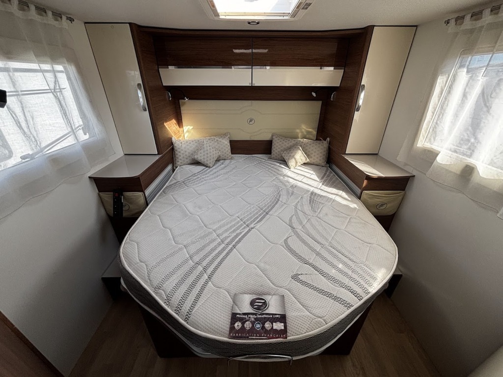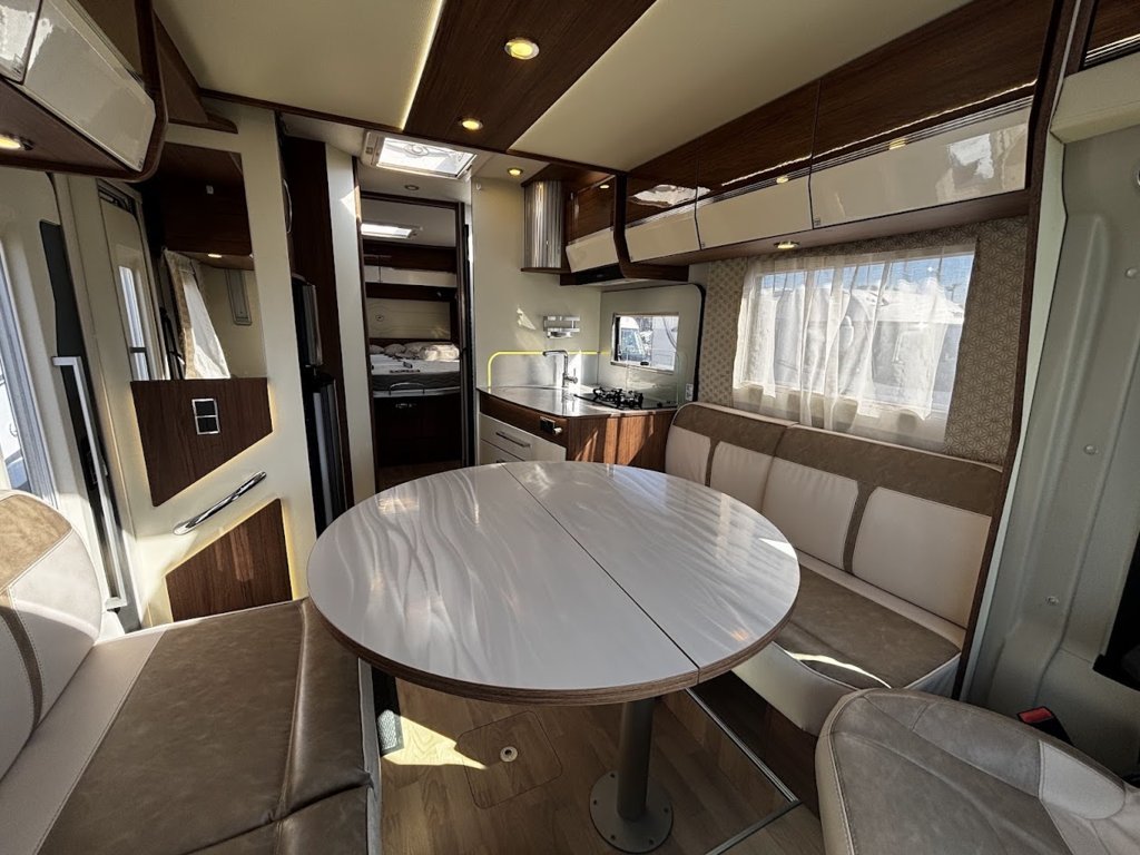 - Disposition : Cuisine en L, Douche indépendante, Lit central, lit pavillon, Salon avant sièges pivotants, Salon en L, WC Cassette