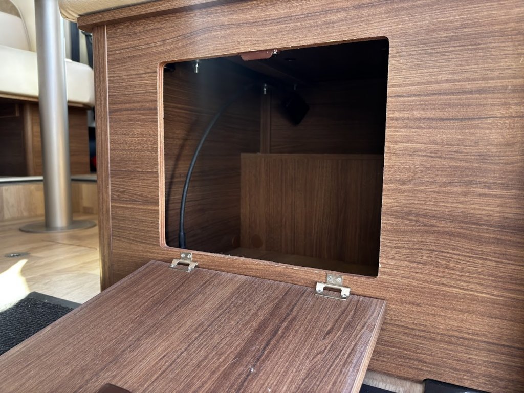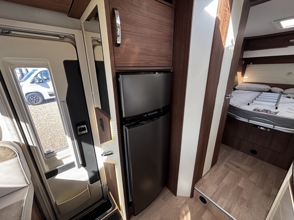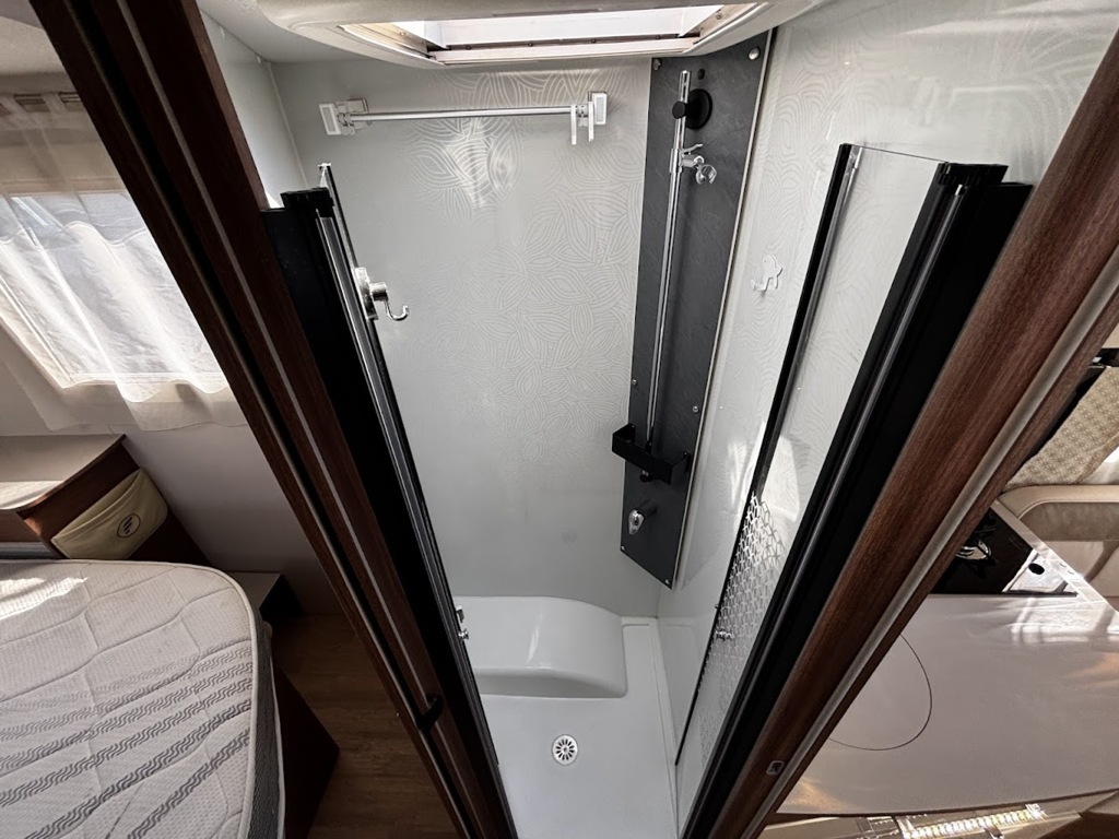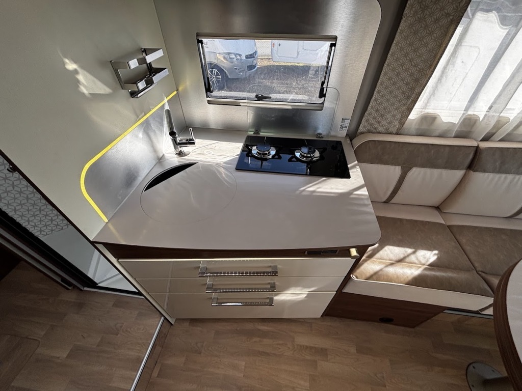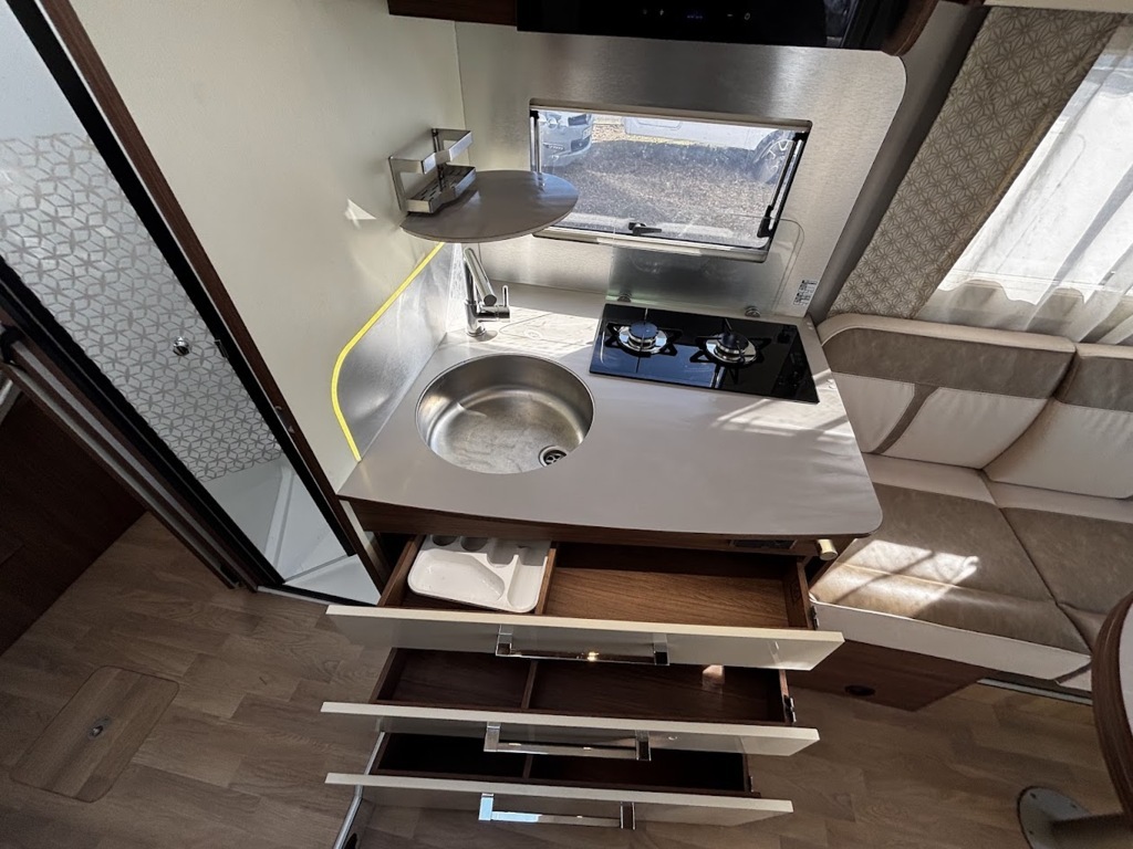 - Disposition : Cuisine en L, Douche indépendante, Lit central, lit pavillon, Salon avant sièges pivotants, Salon en L, WC Cassette
