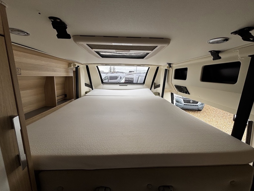 Bac de douche, Cuisine en L, Lit central, Lit dînette avant, lit pavillon, Salon en L, WC Cassette.