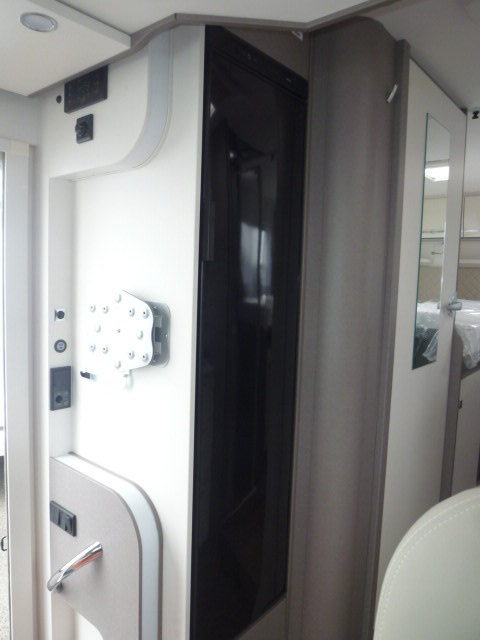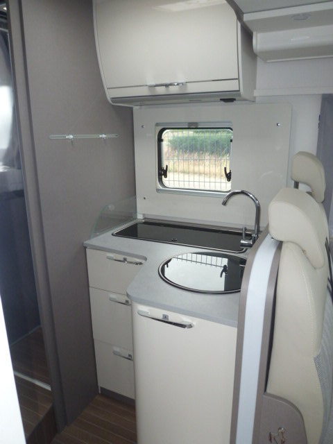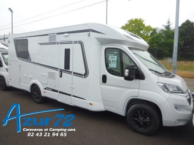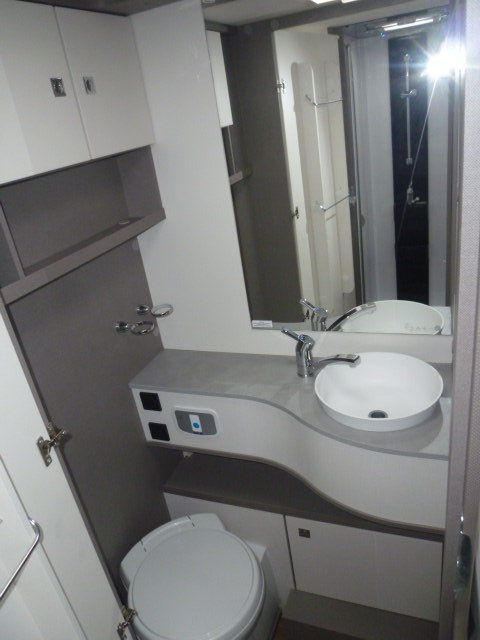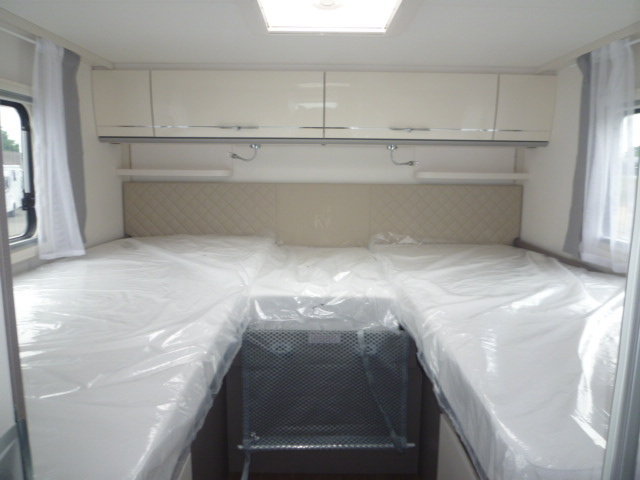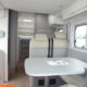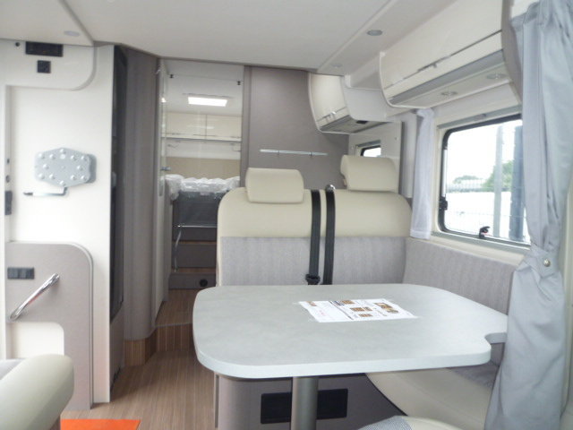 Cuisine en L, Douche indépendante, Grande soute, lit jumeaux, lit pavillon, Salon avant banquettes face à face, Salon avant sièges pivotants, WC Cassette.