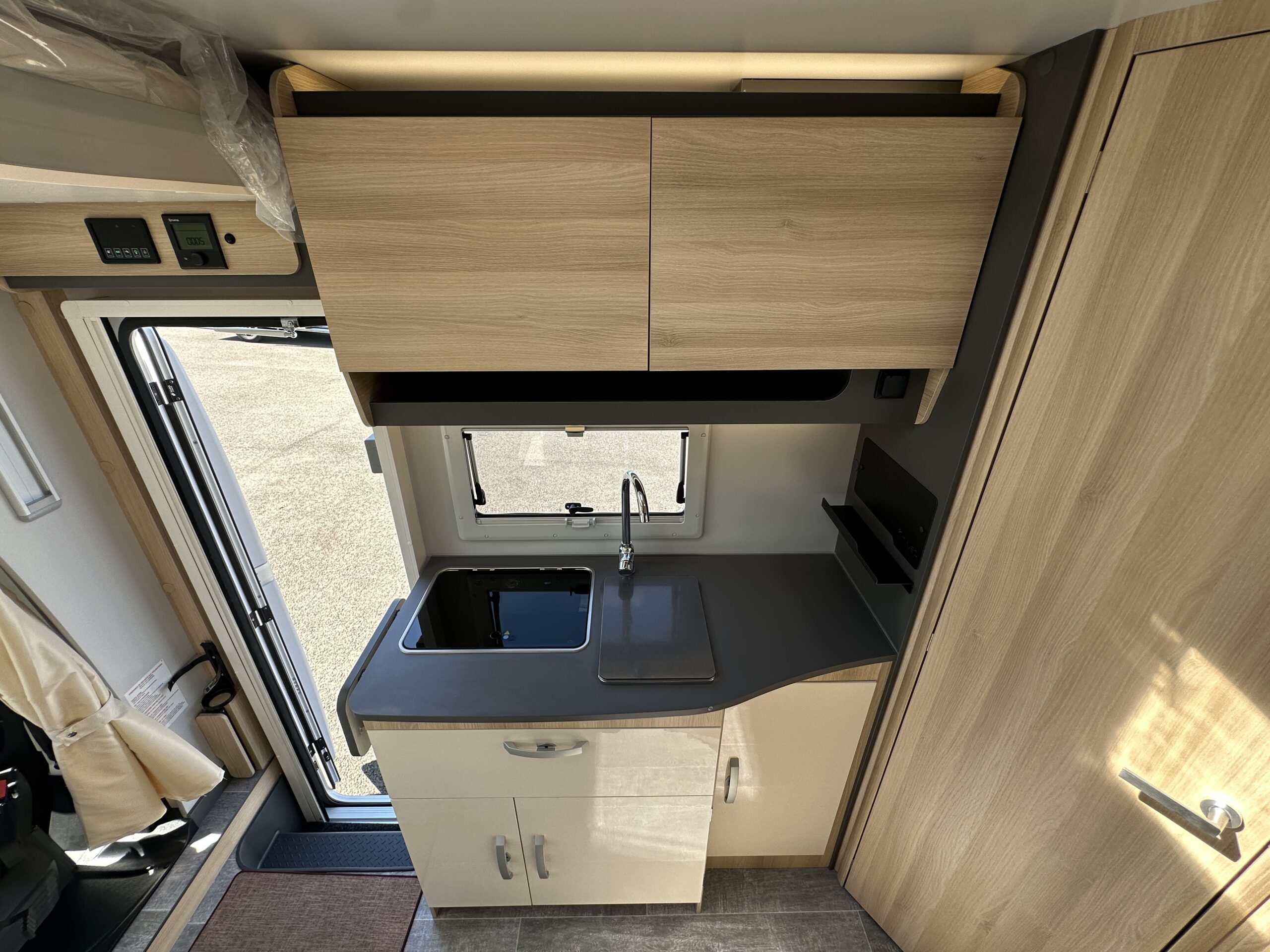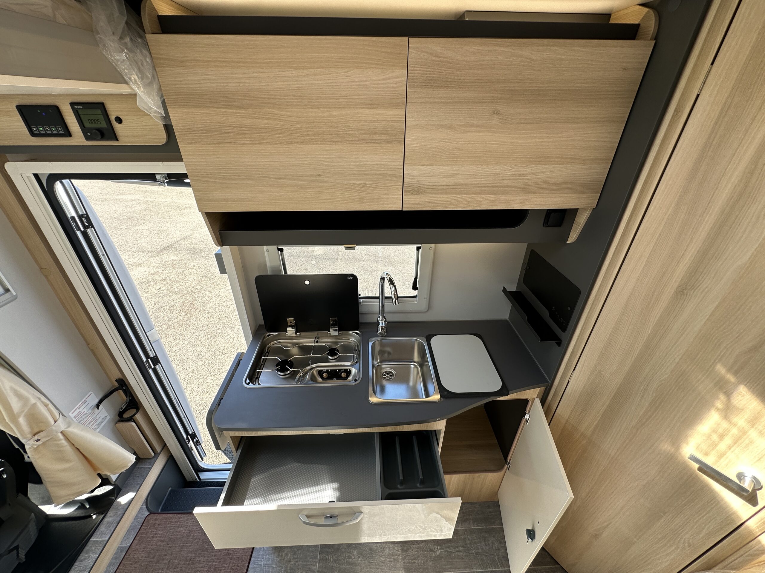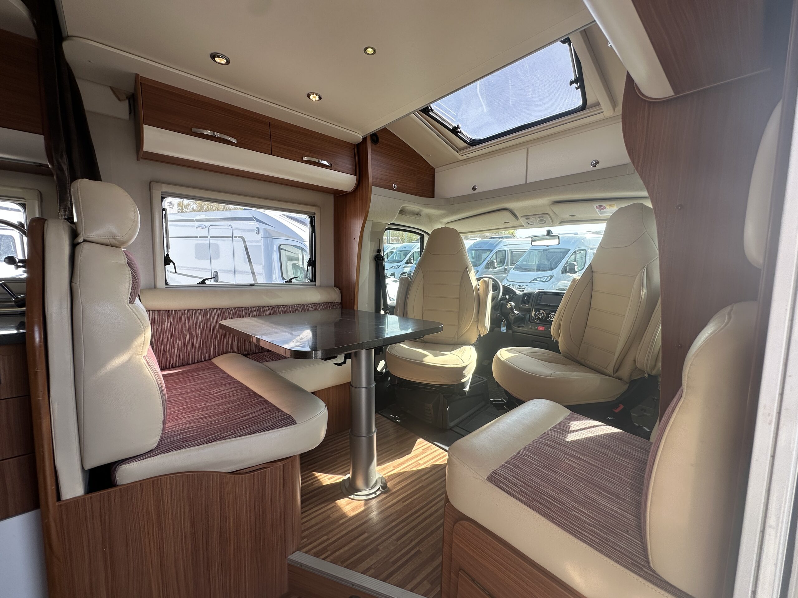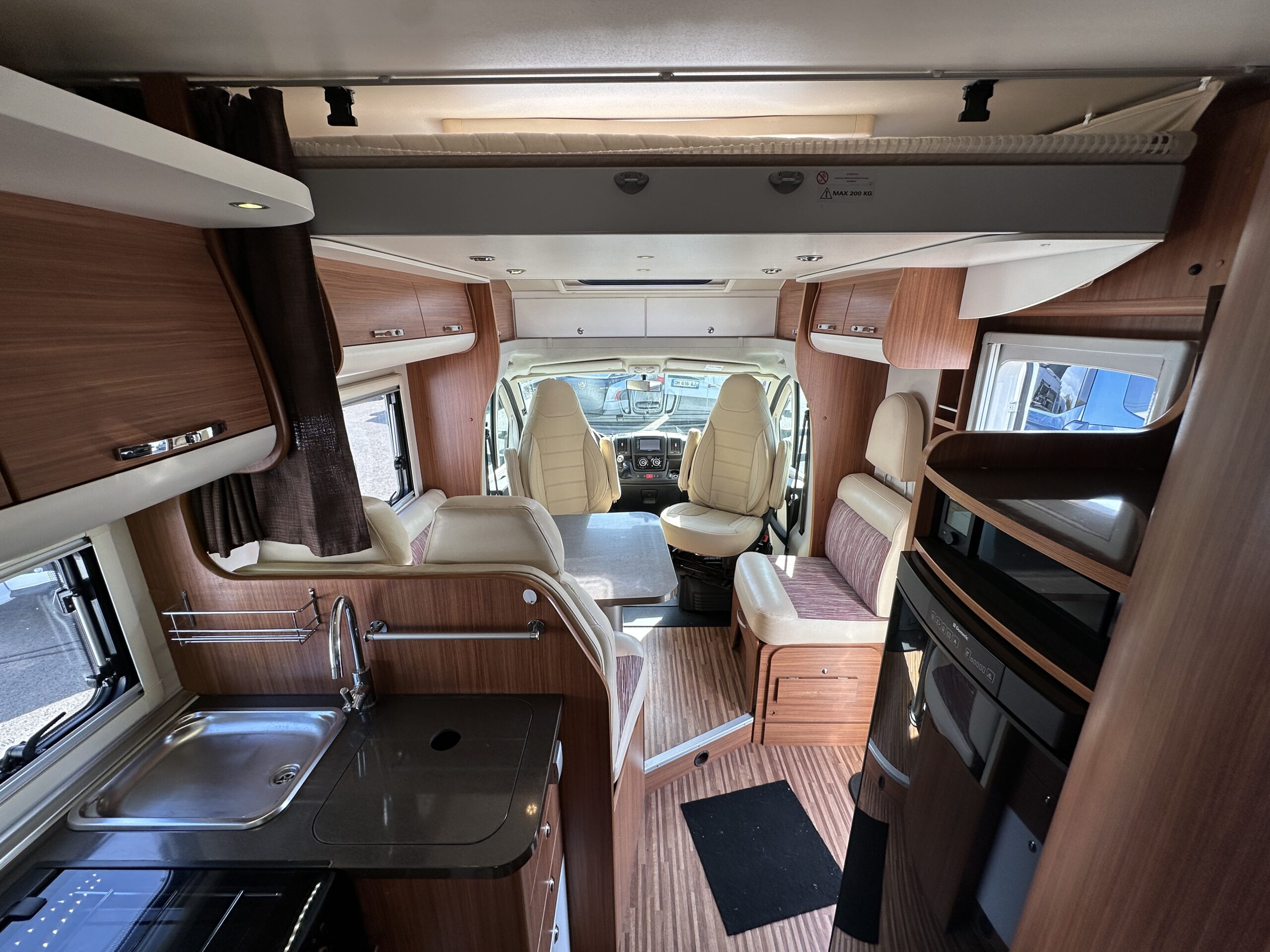 - Disposition : Cuisine en long, Douche à vario, Grande soute, Lit dînette avant, lit jumeaux, Salon avant sièges pivotants, WC Cassette