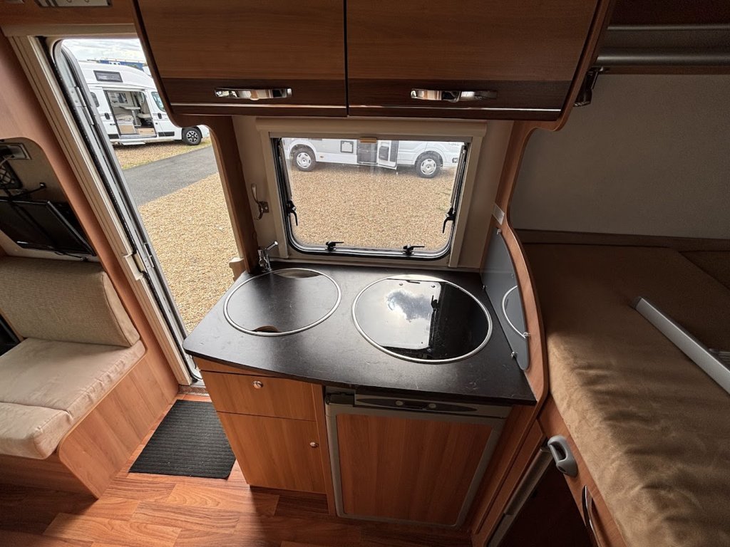 • Disposition : Cuisine en long, Douche à vario, Grande soute, Lit arrière transversal, Lit toit relevable, Salon avant sièges pivotants, WC Cassette